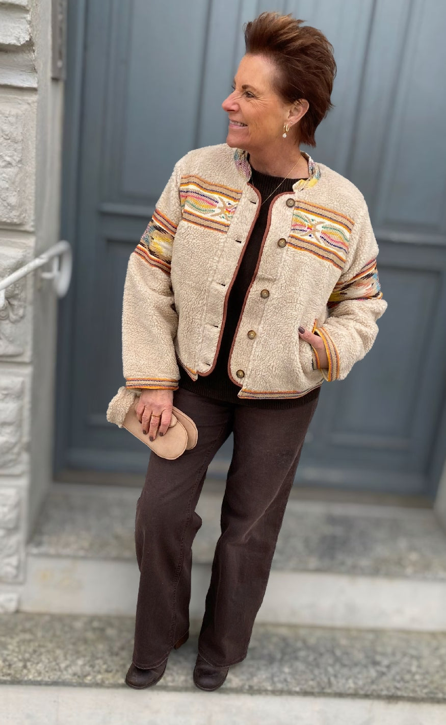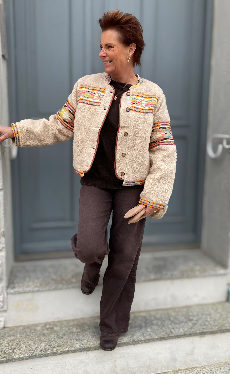 Blød teddyjakke i beige med farverige etniske mønsterdetaljer og knaplukning – en varm og stilfuld favorit fra Lollys Laundry.