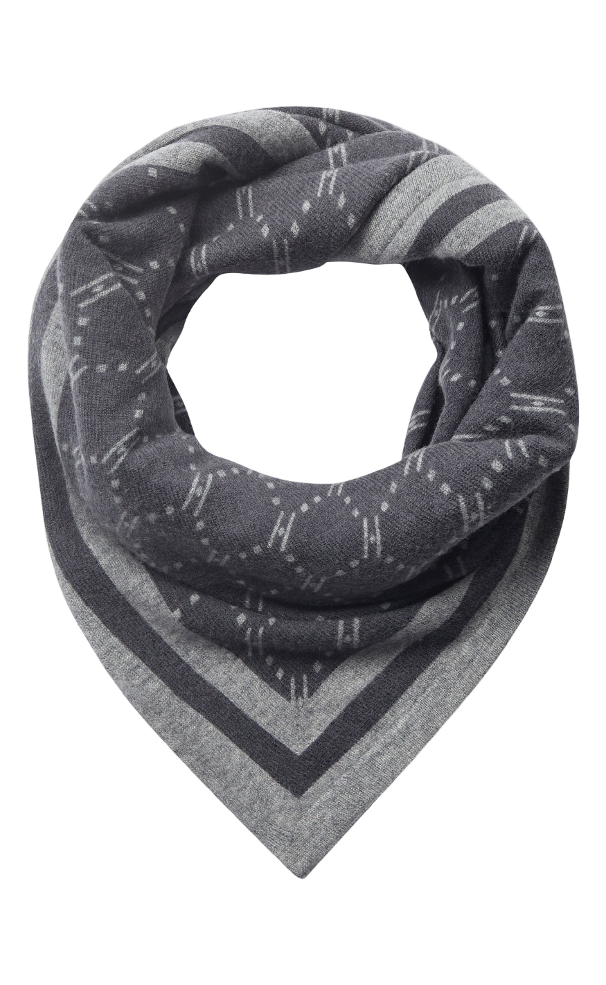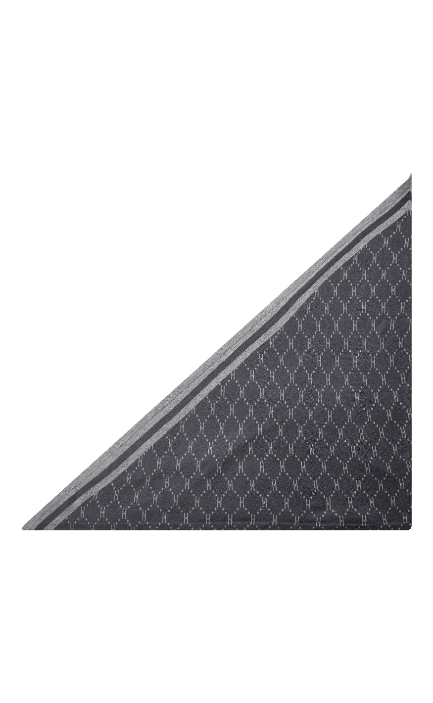 Grå tørklæde fra Hype The Detail med monogrammønster og kontrastkant – et blødt og stilfuldt accessory til at fuldende dit look.