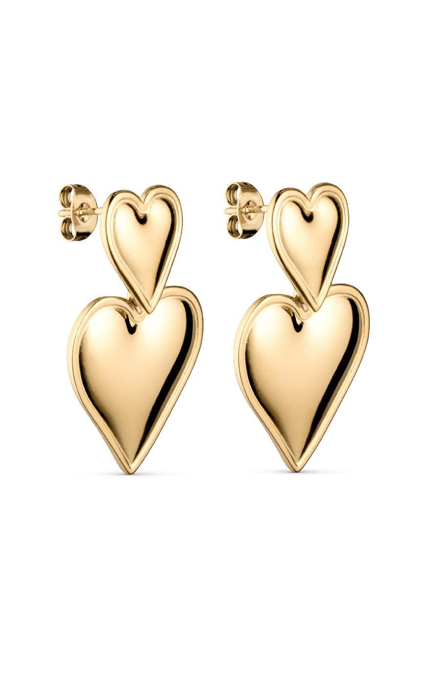Populære øreringe fra Smykkeli Copenhagen med to hjerter i guld. Øreringene har et eksklusivt udtryk og kan anvendes til enhver lejlighed!
