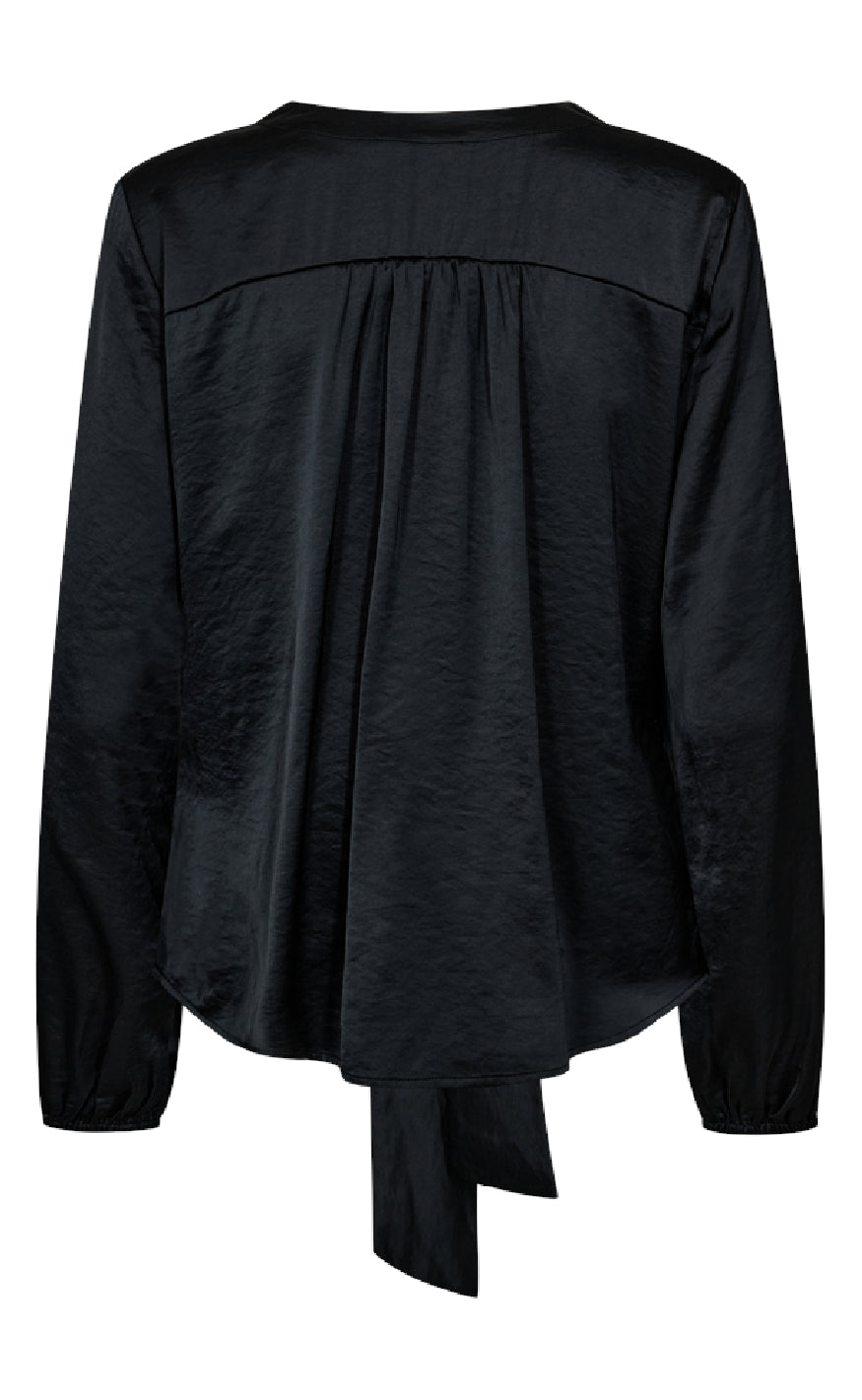 Flot skjorte fra Freequent i glansfuldt sort stof med V-udskæring, knapper foran og lange ærmer.