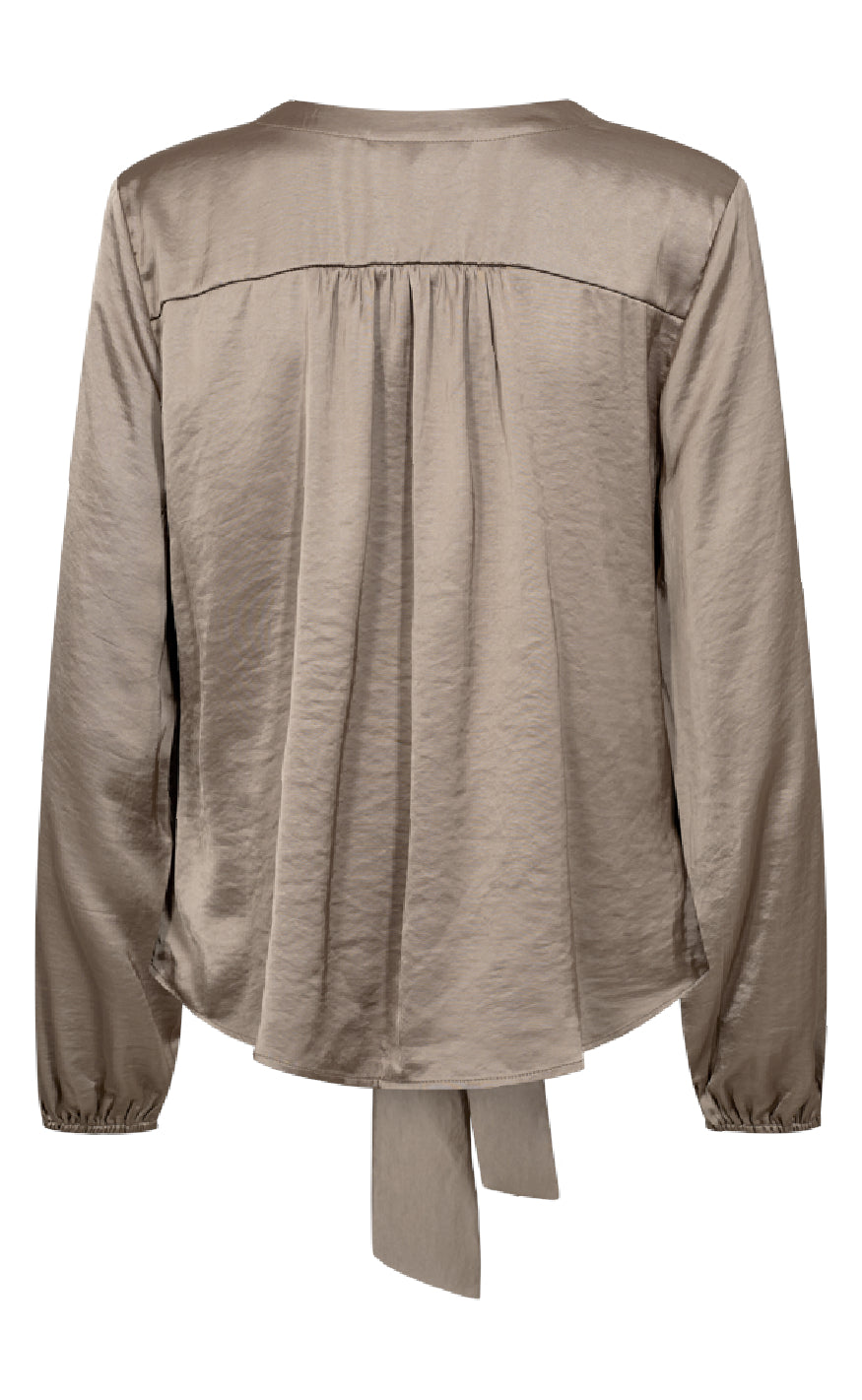 Flot skjorte fra Freequent i glansfuldt taupefarvet stof med V-udskæring, knapper foran og lange ærmer.