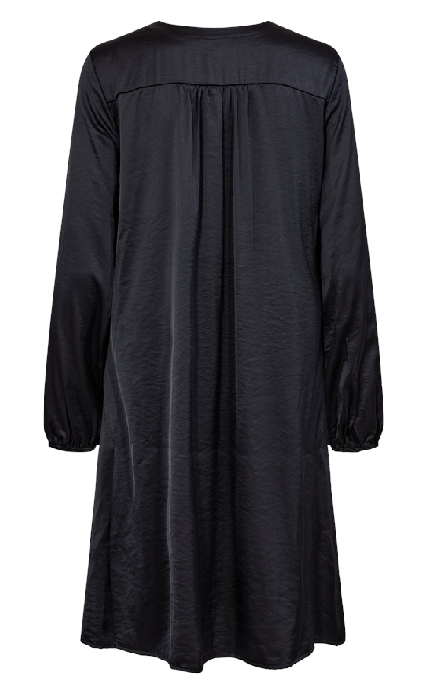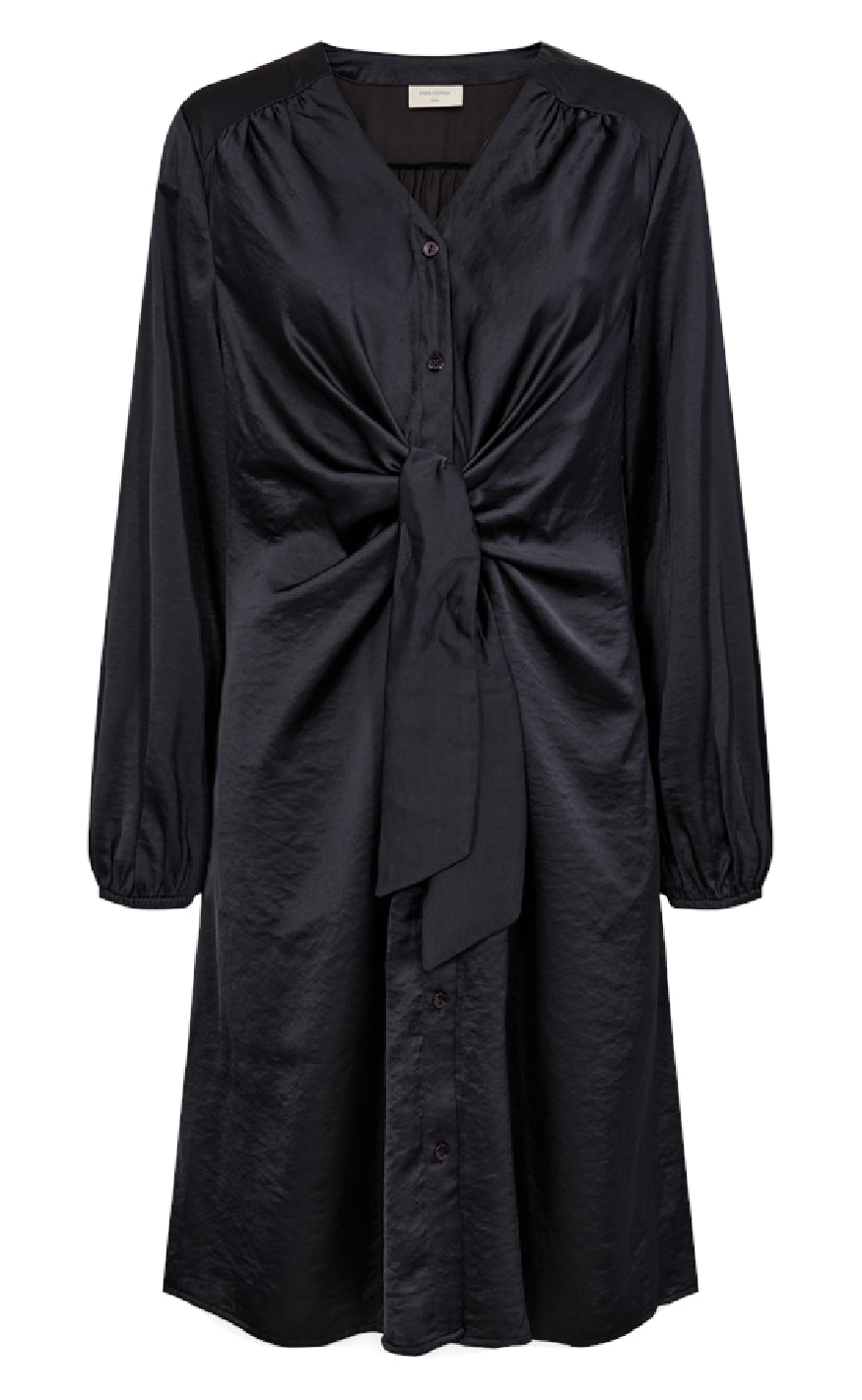 En knælængde skjortekjole fra Freequent i glansfuldt sort stof med V-udskæring, knapper foran og lange ærmer.