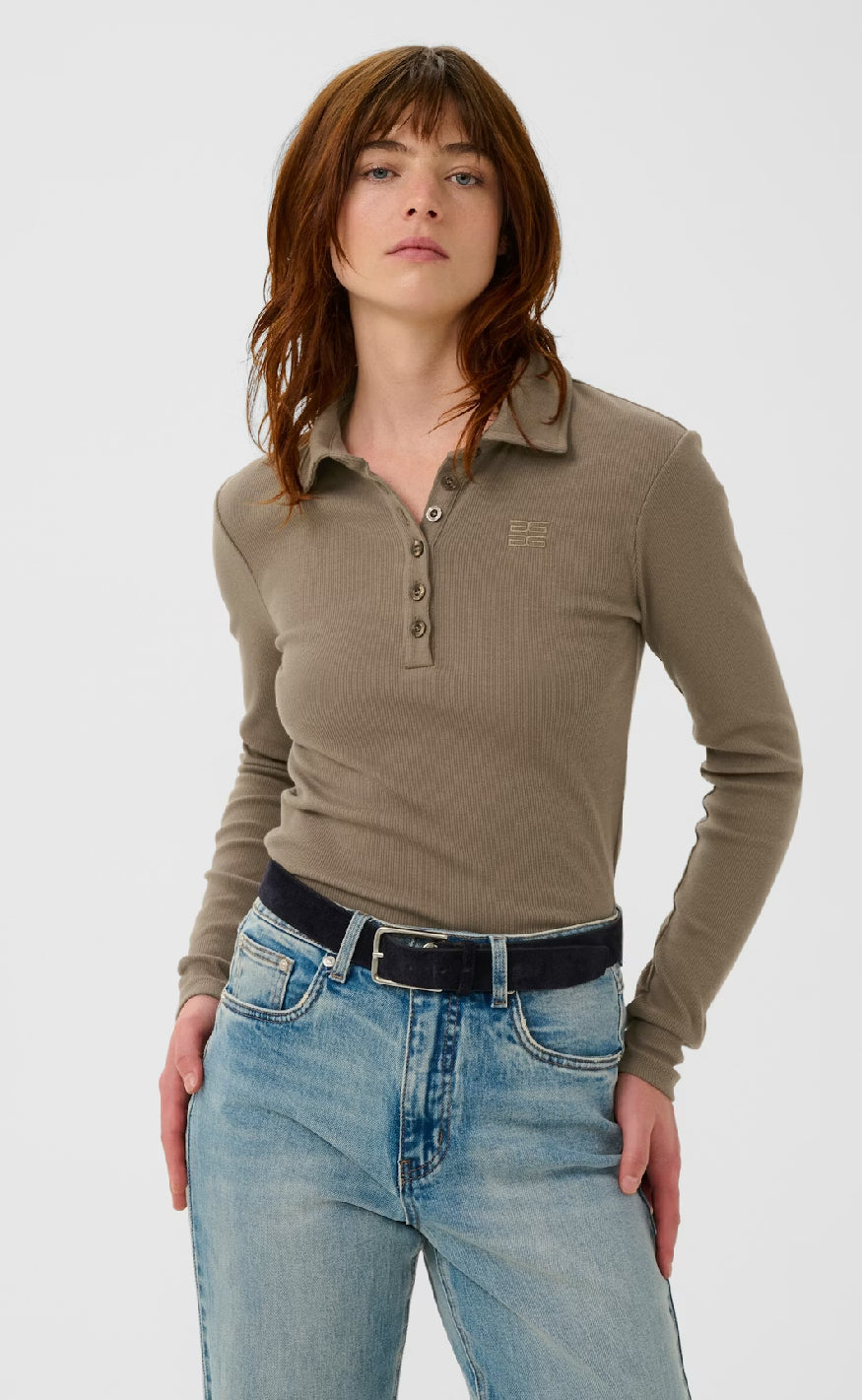 Skjorten har lange ærmer og en kort knaplukning foran med fem knapper samt diskret logo-detalje på brystet.