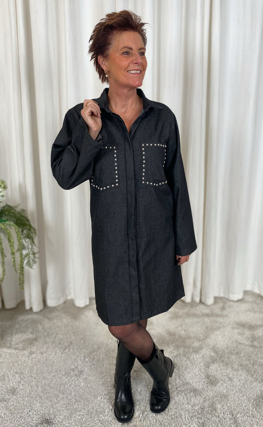 Smart denim kjole fra Say INA Copenhagen i gråsort med sølv nitter ved lommerne.