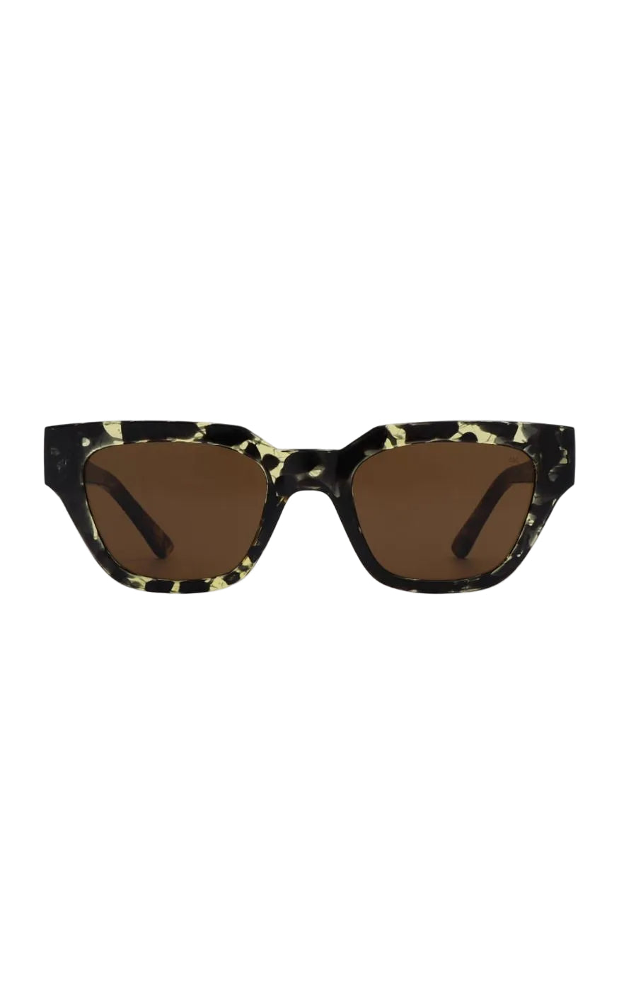 Karakterfulde solbriller fra A. Kjærbede med et iøjnefaldende og moderne design. Den markante, firkantede form giver et stærkt statement, mens rammen med sort og lys tortoise-mønster tilfører et unikt og grafisk udtryk.