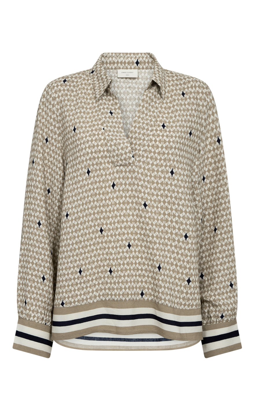 Let og feminin bluse fra Freequent i en sandfarvet nuance med et fint, grafisk mønster.