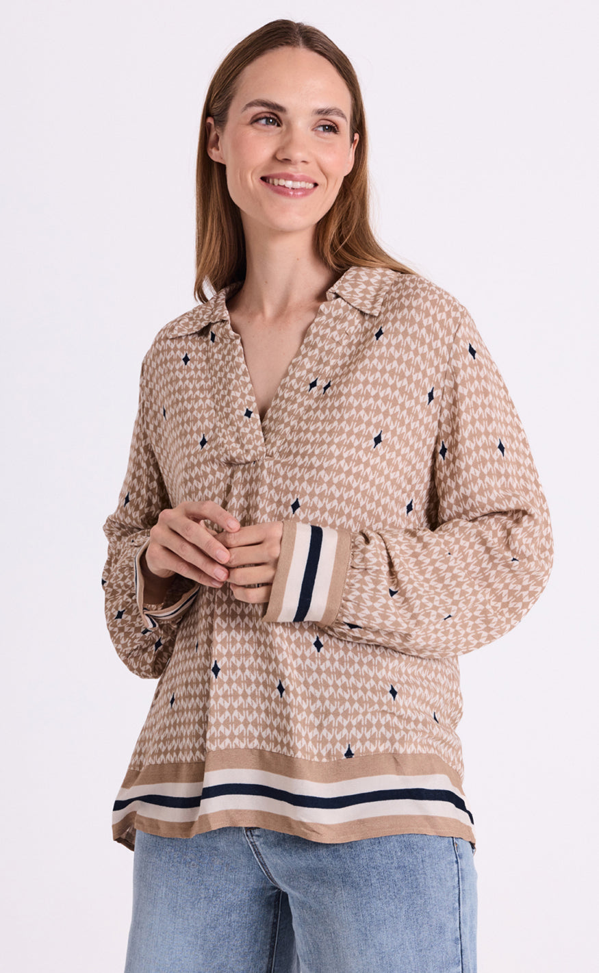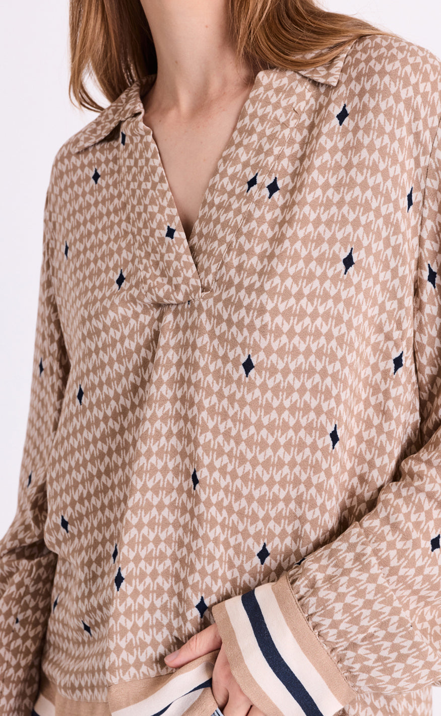 Blusen har lange ærmer, klassisk krave og V-udskæring uden knapper samt manchetter og kant forneden med kontraststriber, der giver et elegant og velafbalanceret udtryk.