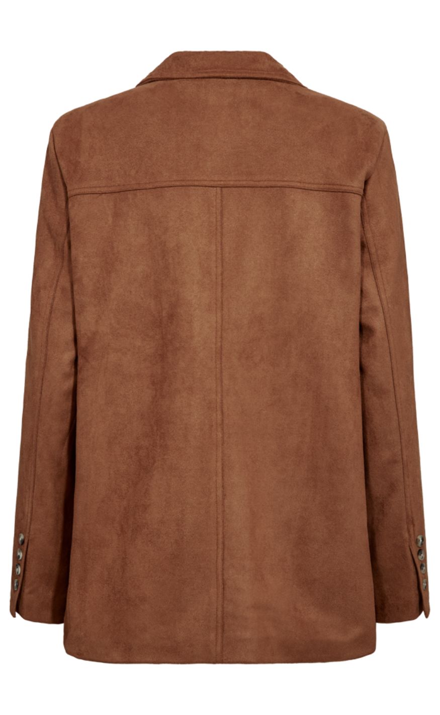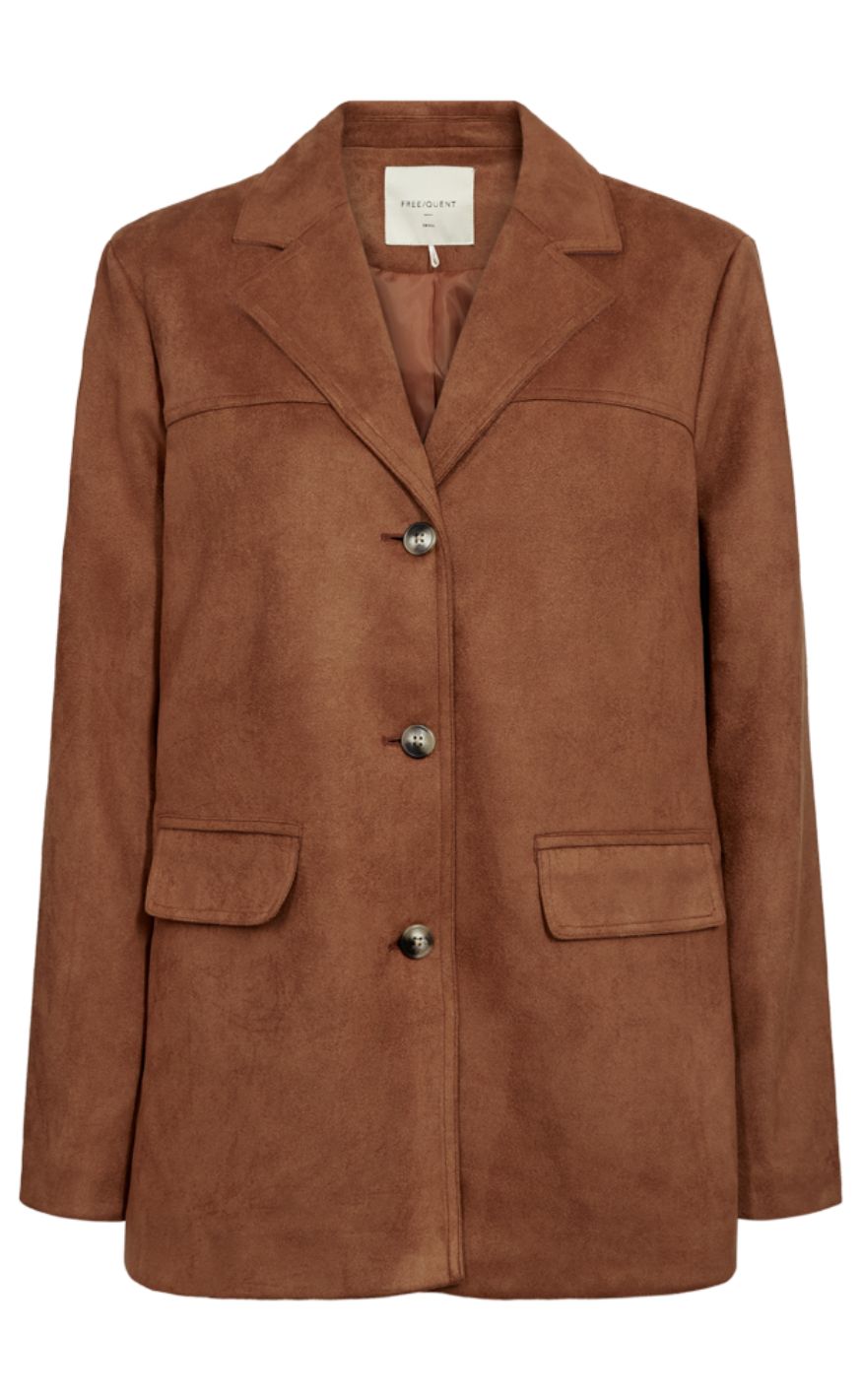 Klassisk jakke fra Freequent i en varm brun nuance med et enkelt og tidløst udtryk. Jakken har reverskrave, knaplukning foran og lange ærmer, som giver et pænt og velordnet look.