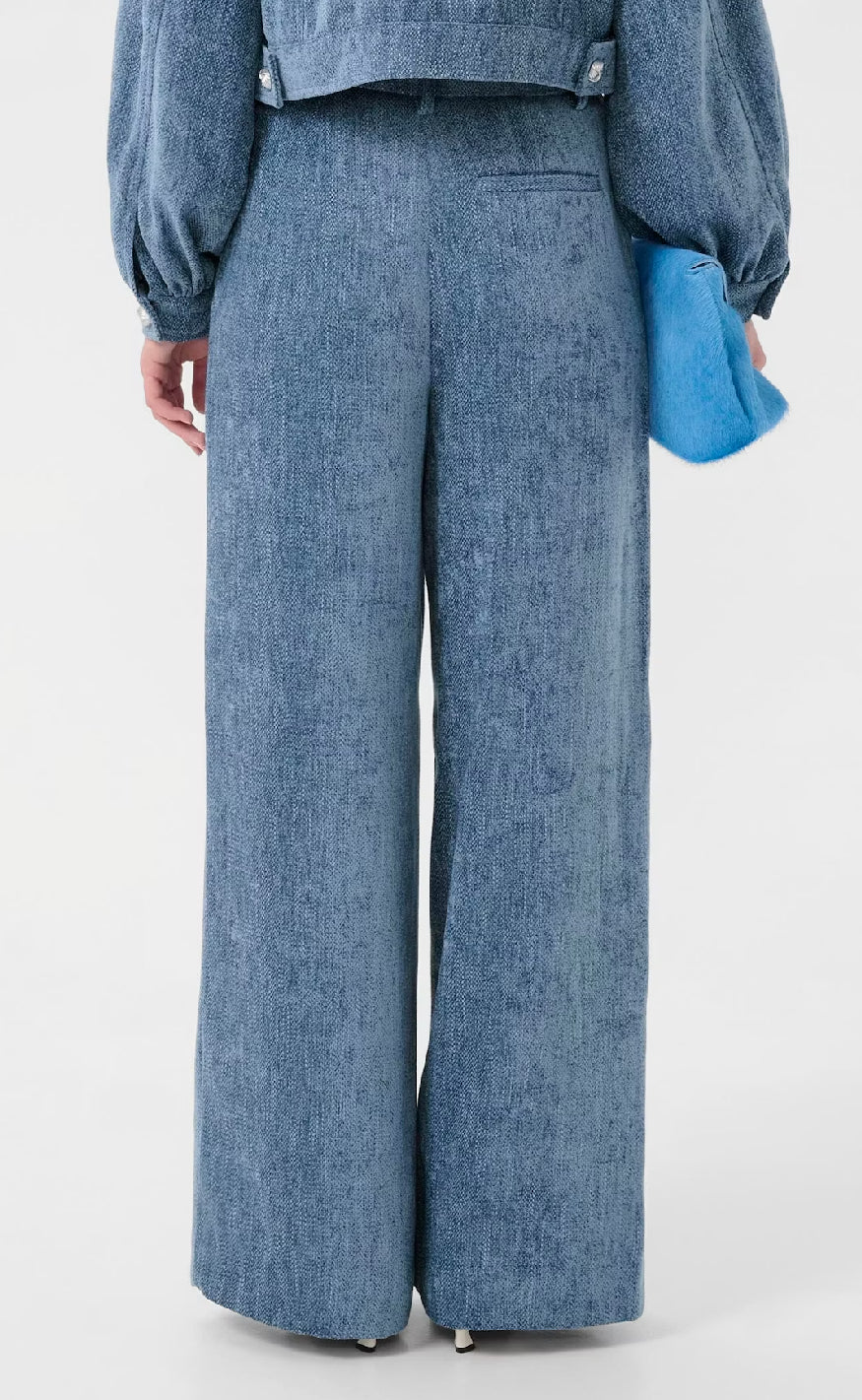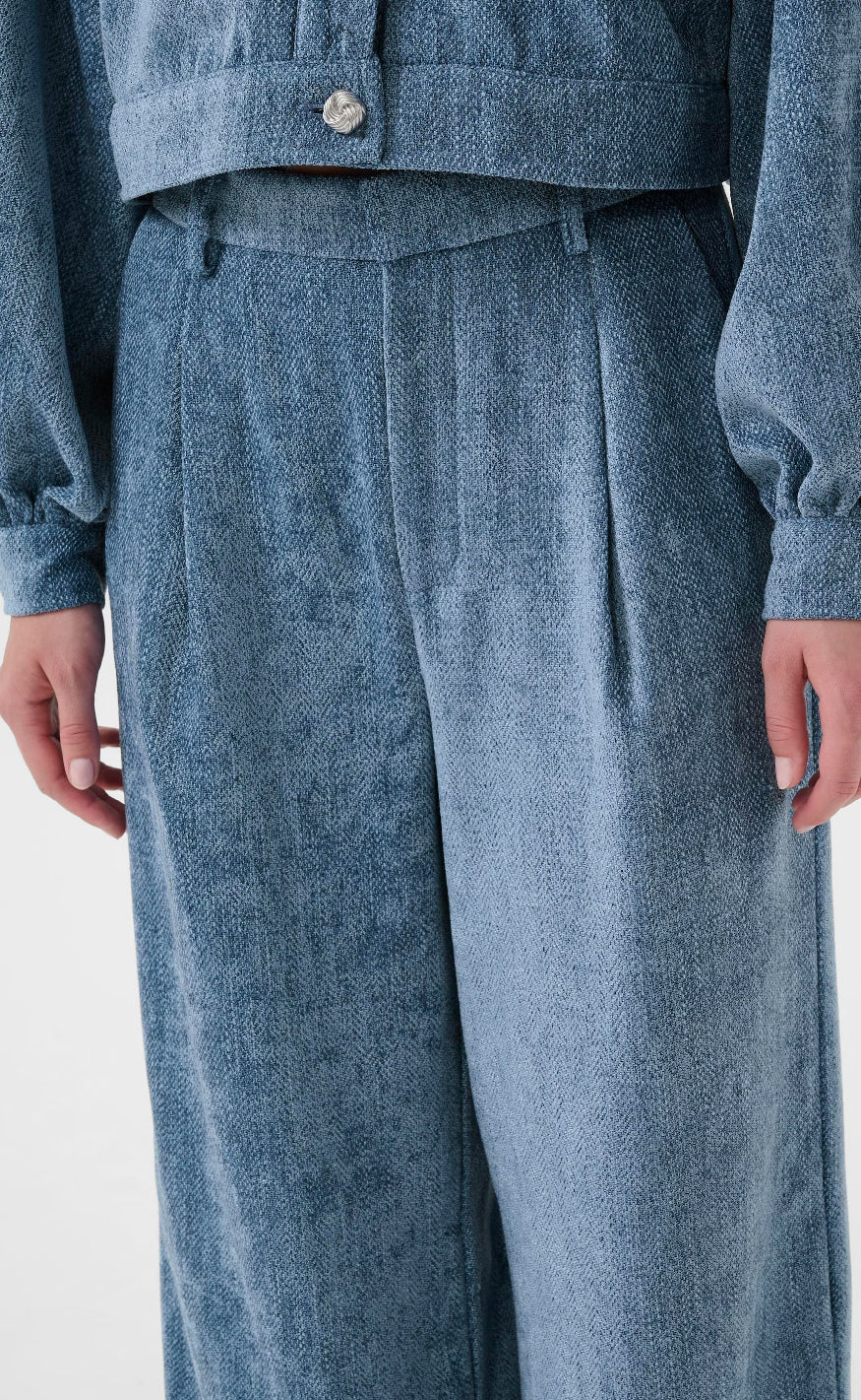 Bukser fra Gestuz i en lys blå tekstur med elegant og blød overflade.