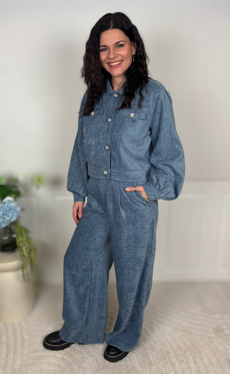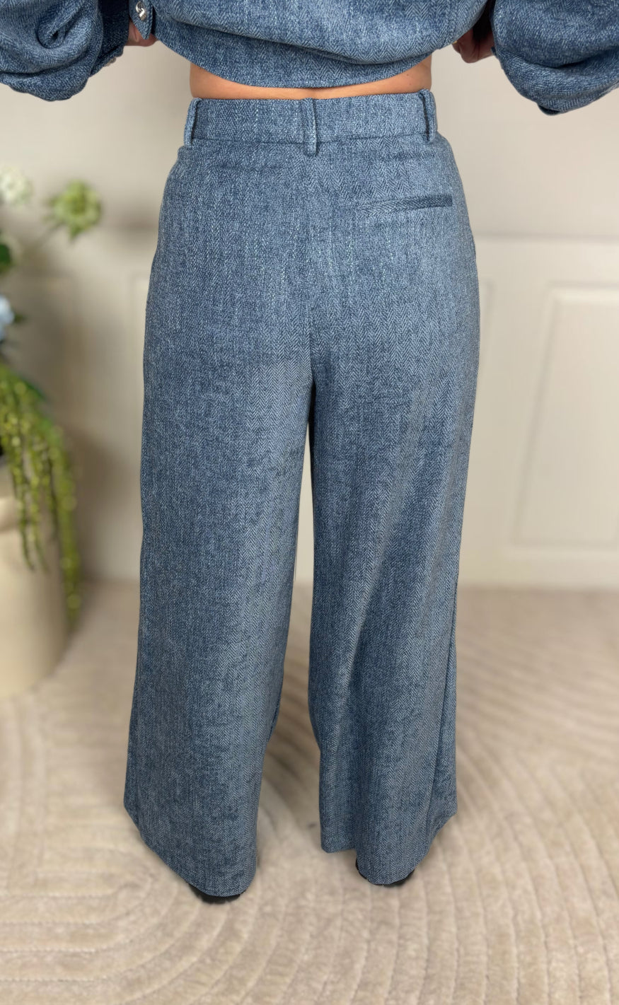 Bukserne har høj talje, vide ben og lynlås- samt knaplukning foran.