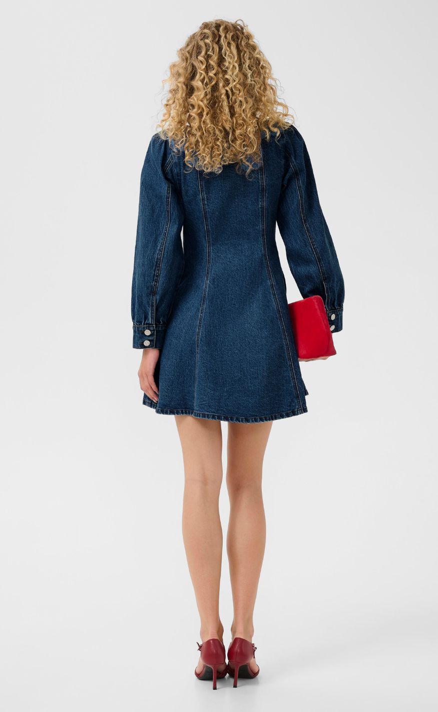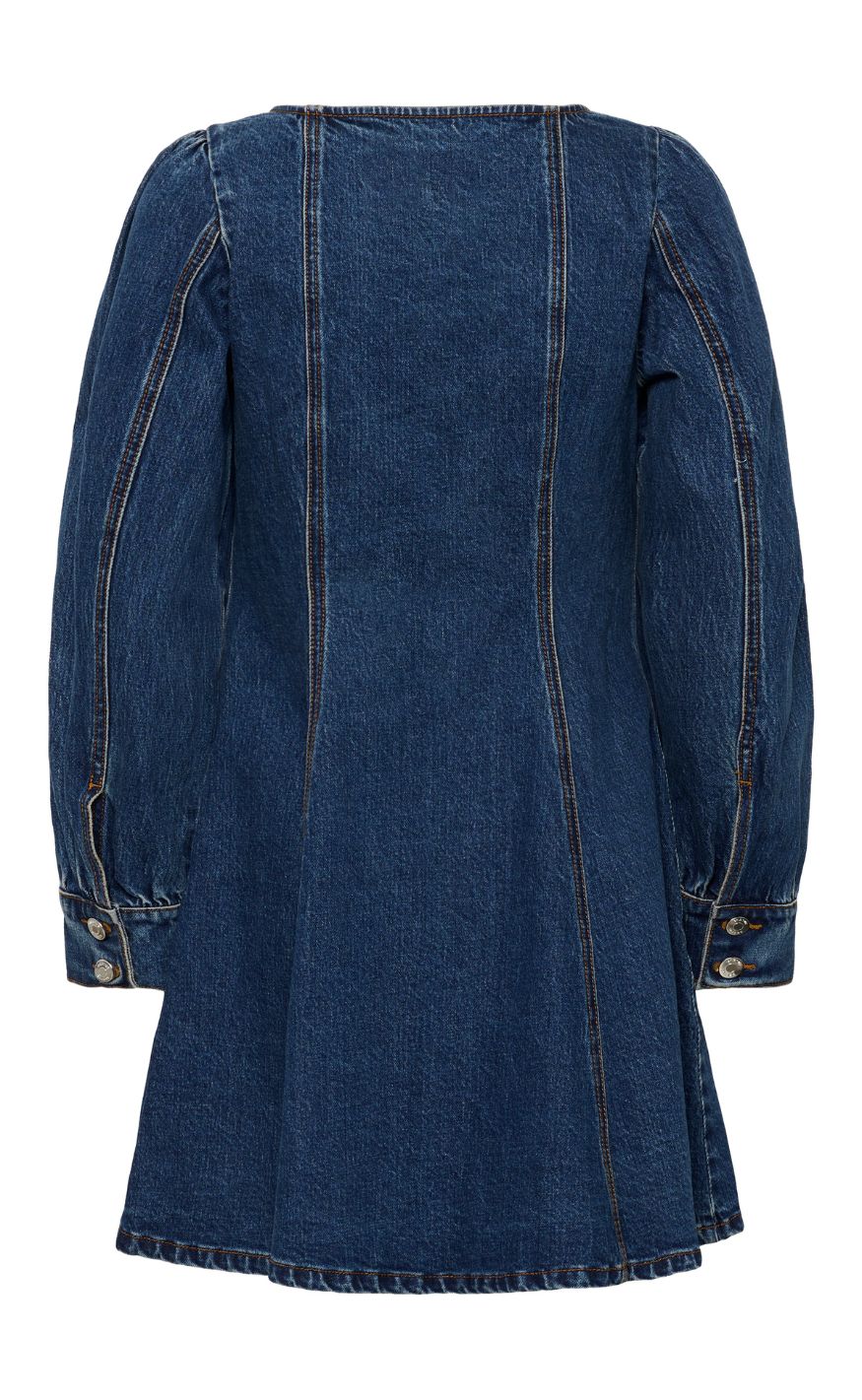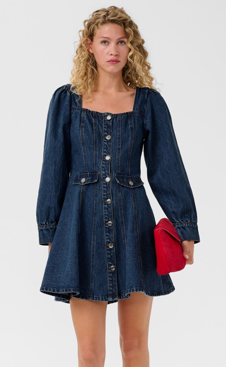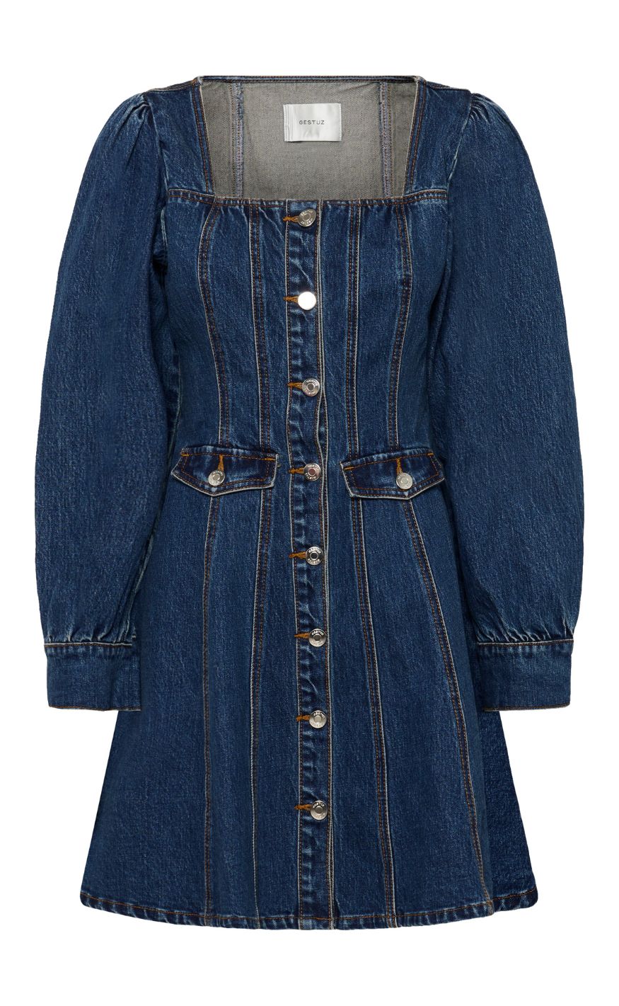 Feminin denimkjole fra Gestuz i en klassisk blå vask med et struktureret og tidløst udtryk. Den firkantede halsudskæring og de lange ærmer med let volumen giver kjolen et markant, men enkelt look.