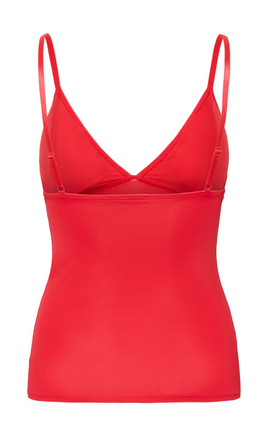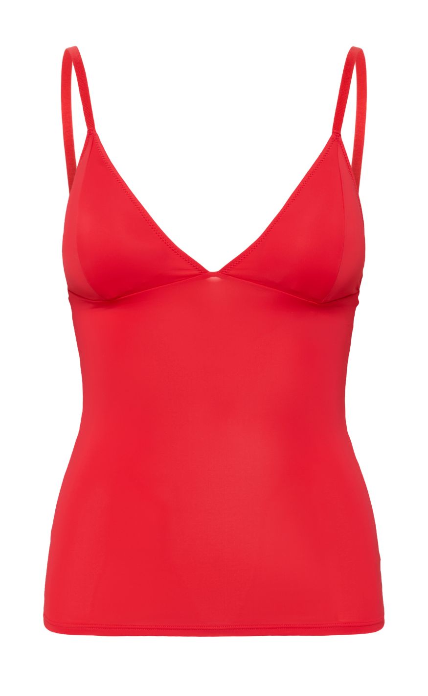 Tætsiddende top fra Gestuz i en klar rød farve med smalle, justerbare stropper og V-udskæring. Det enkle snit giver et rent og let udtryk, som følger kroppen uden ekstra detaljer.