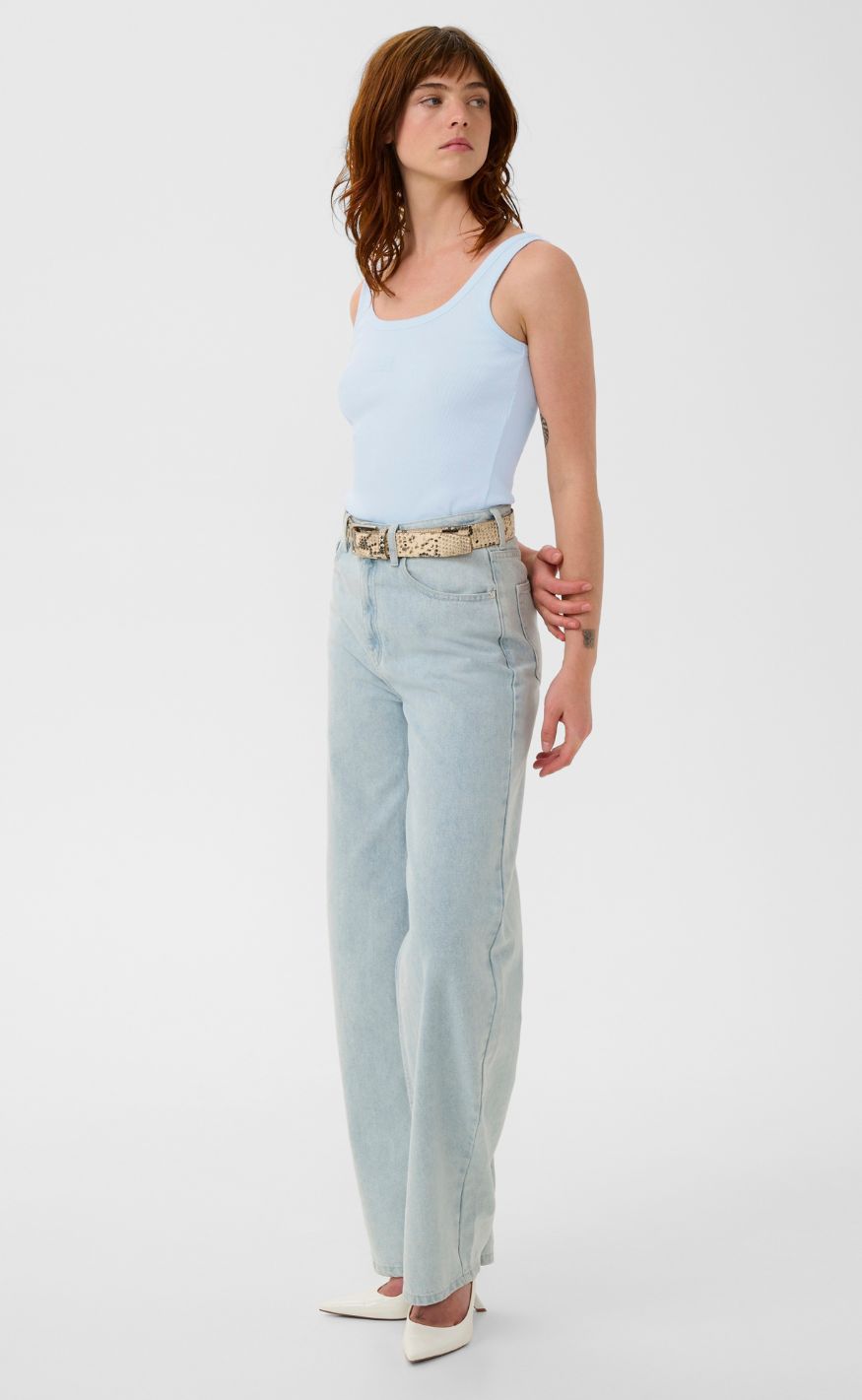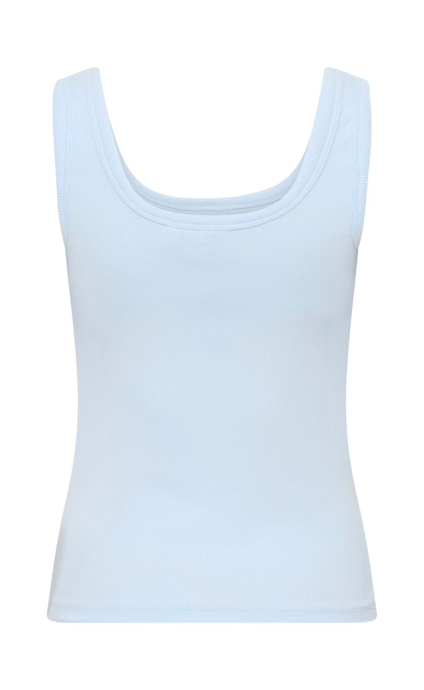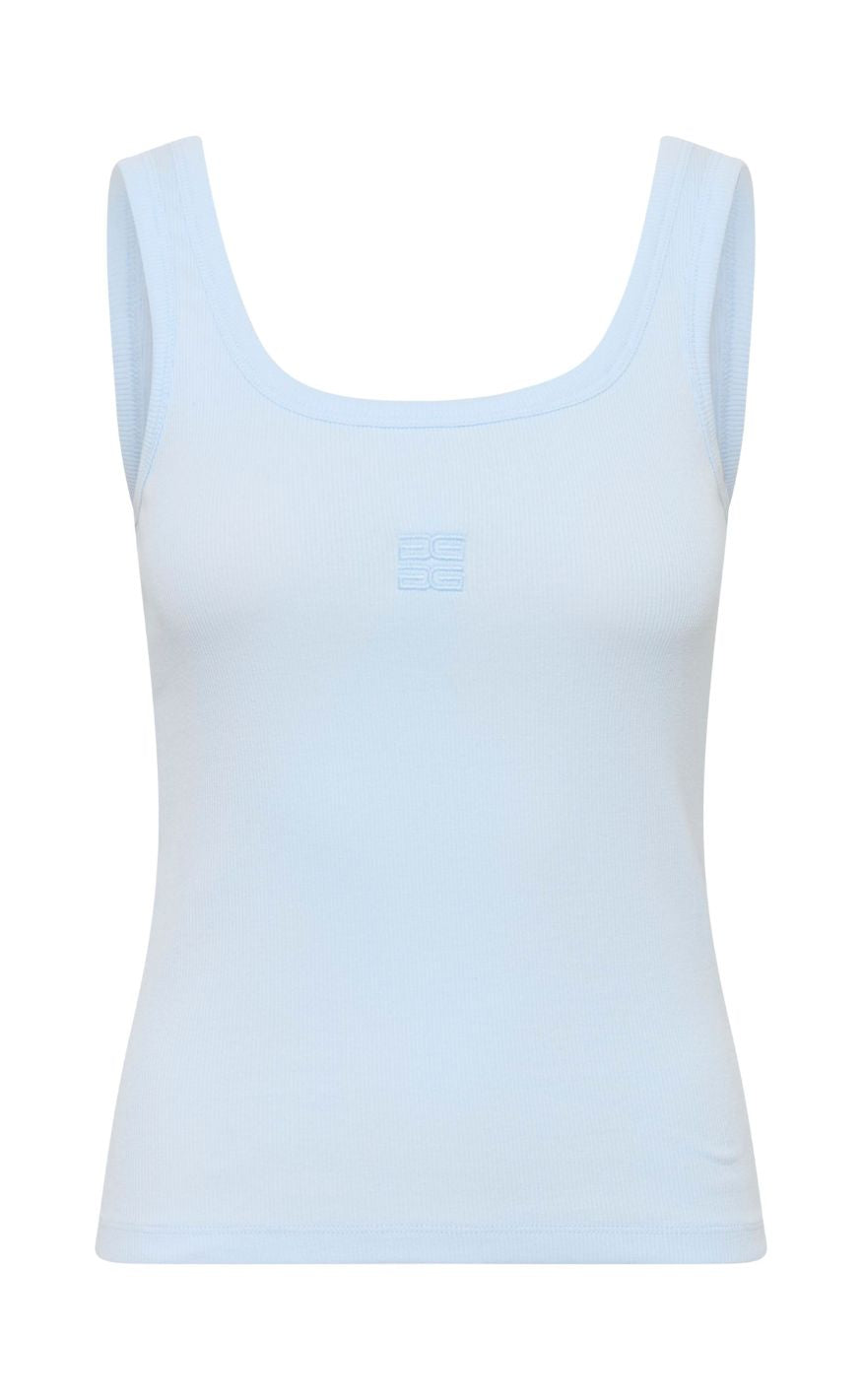 Enkel top fra Gestuz i en lys, blød blå nuance med et rent og minimalistisk design. Den brede strop og den firkantede udskæring giver et moderne og roligt udtryk.