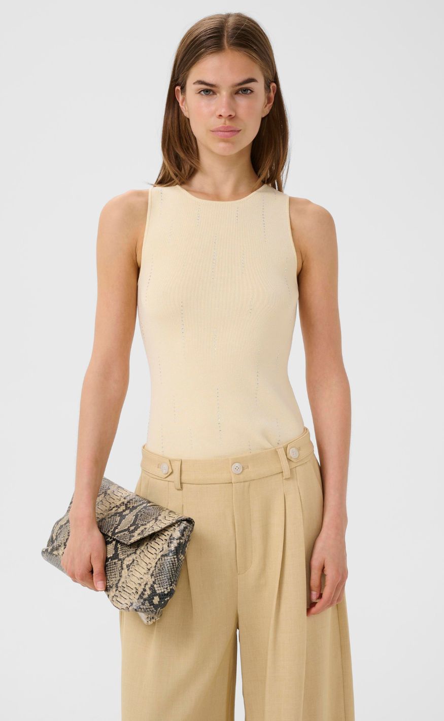 Det enkle design gør toppen nem at style til både hverdag og mere pæne outfits, enten alene eller under skjorte, blazer eller strik.