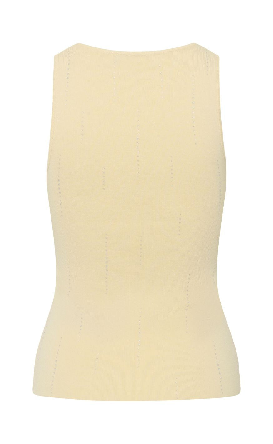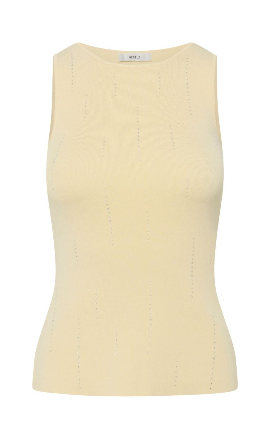 Enkel top fra Gestuz i en blød, lys gul nuance med et feminint og roligt udtryk. Det tætsiddende snit og den runde halsudskæring giver et rent look, mens de små diskrete detaljer i stoffet tilfører let struktur.