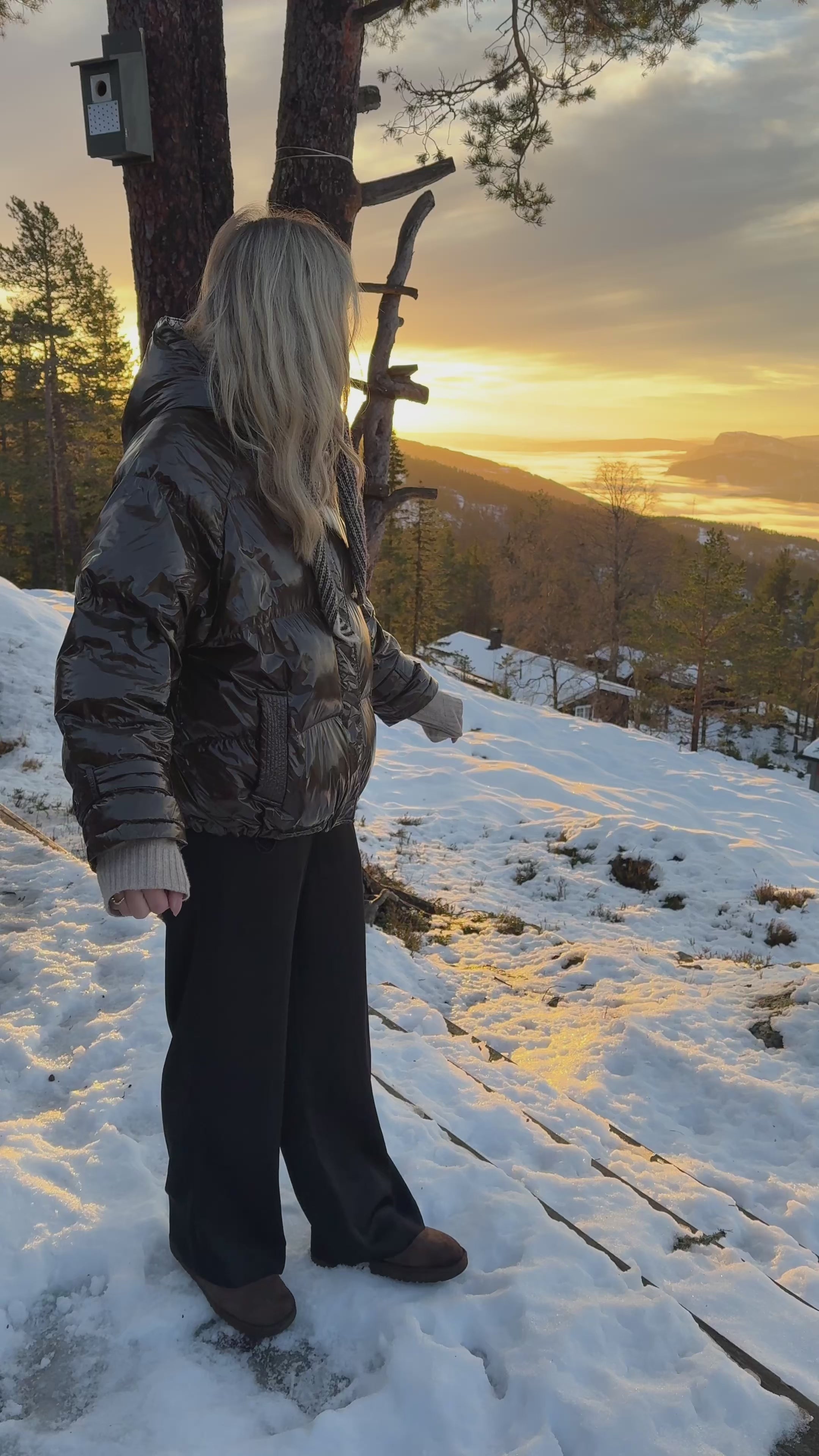 Jakken er stor, kort og har en hætte.