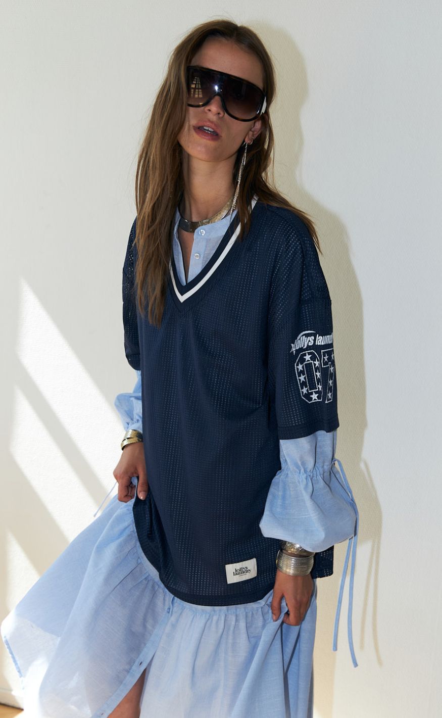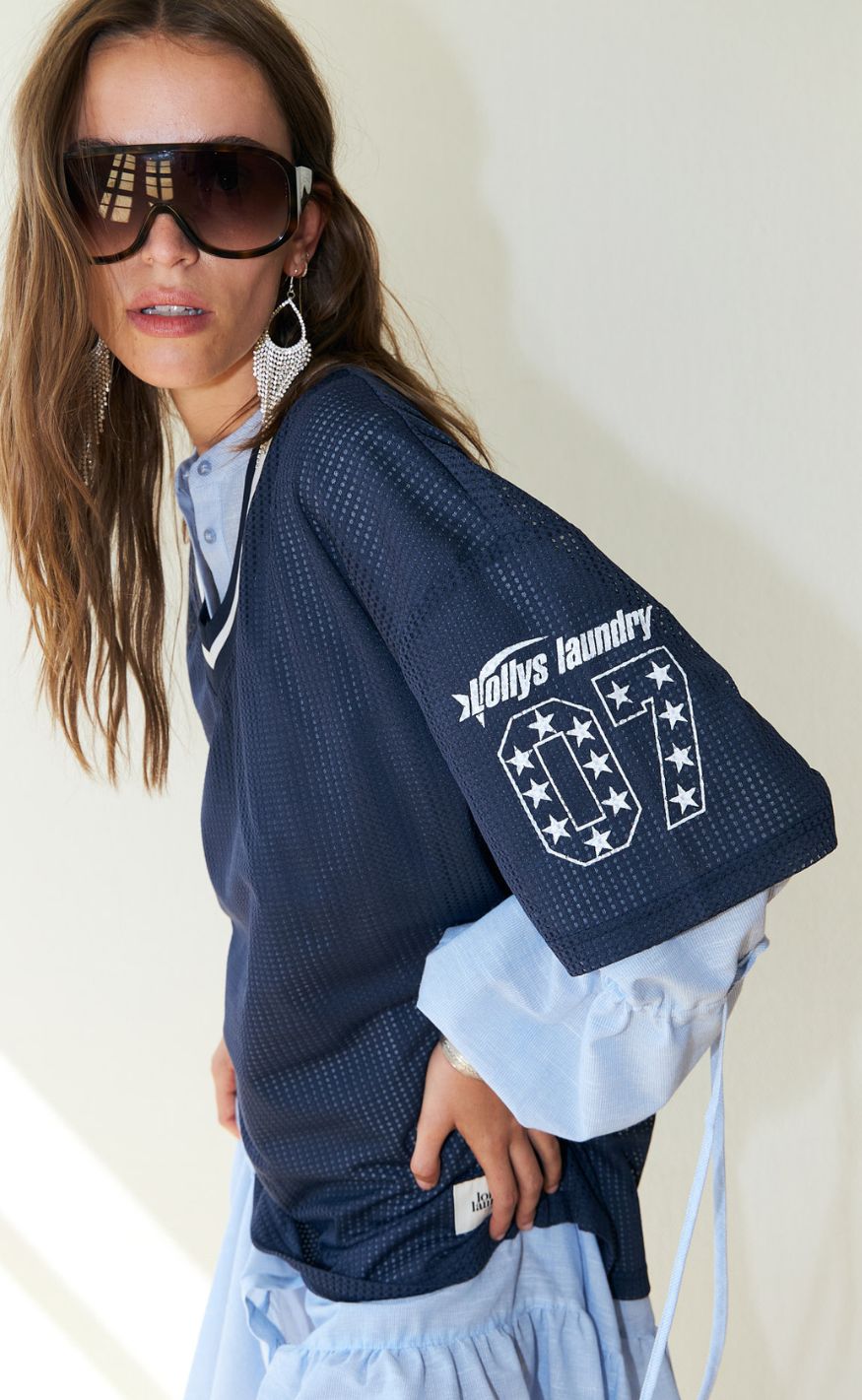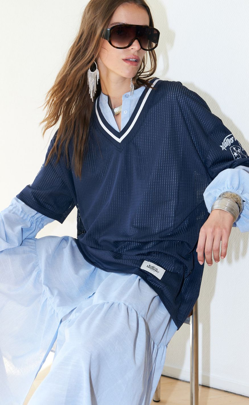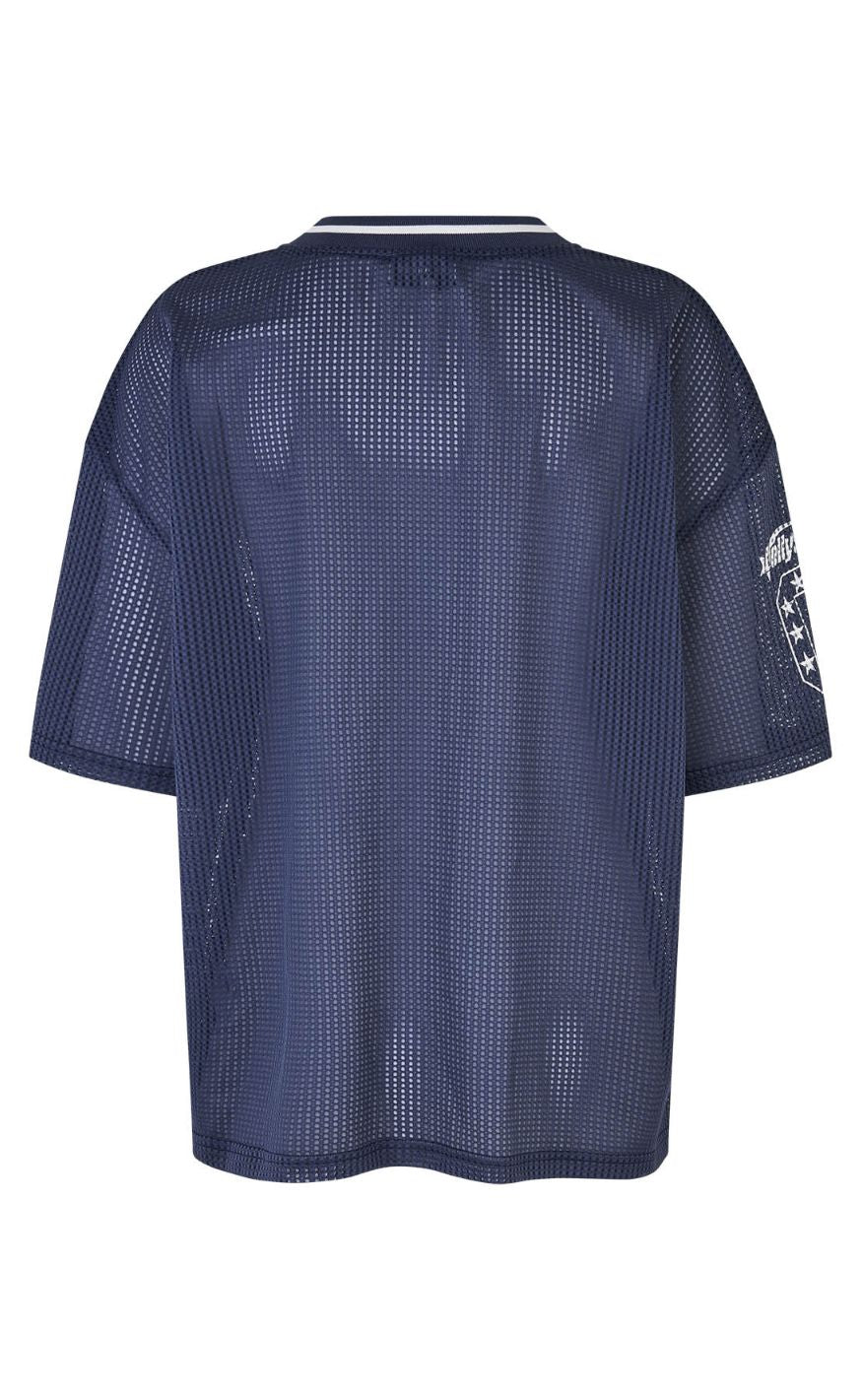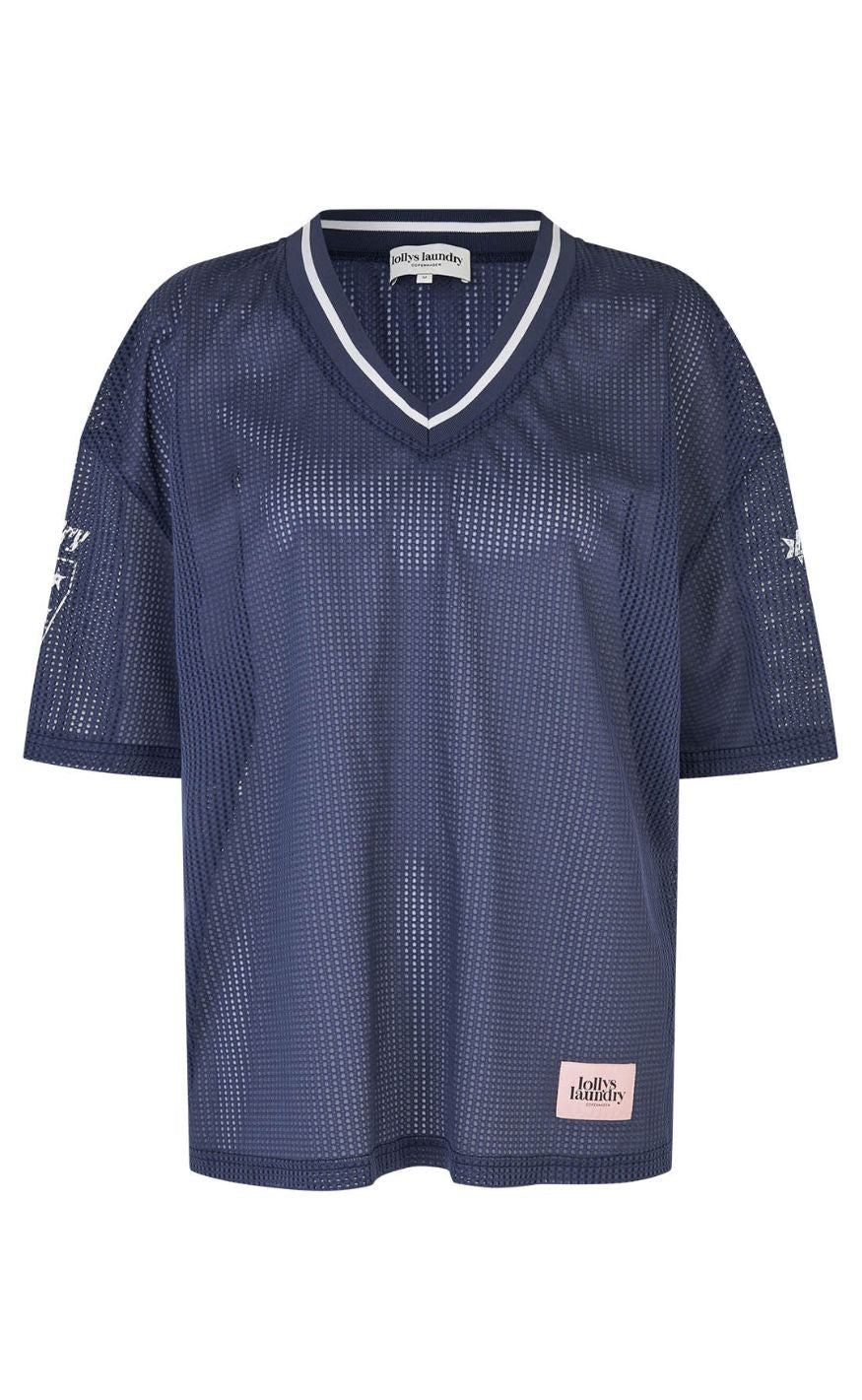 Mørkeblå T-shirt fra Lollys Laundry i let mesh med V-udskæring, korte ærmer og en løs pasform, der giver et afslappet udtryk. Det let gennemsigtige materiale og de diskrete detaljer giver et moderne look, som er nemt at style i lag.