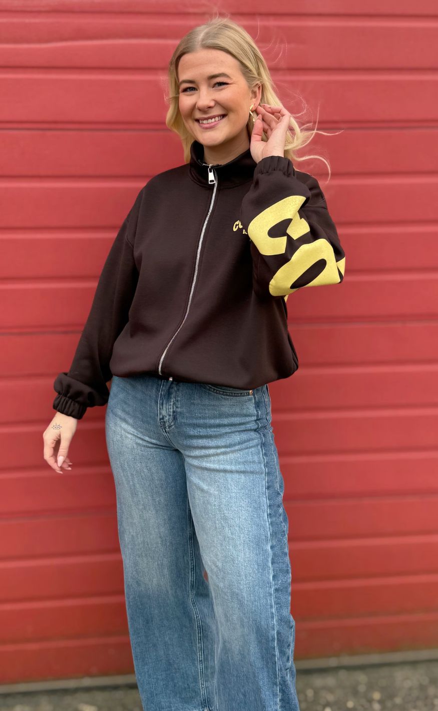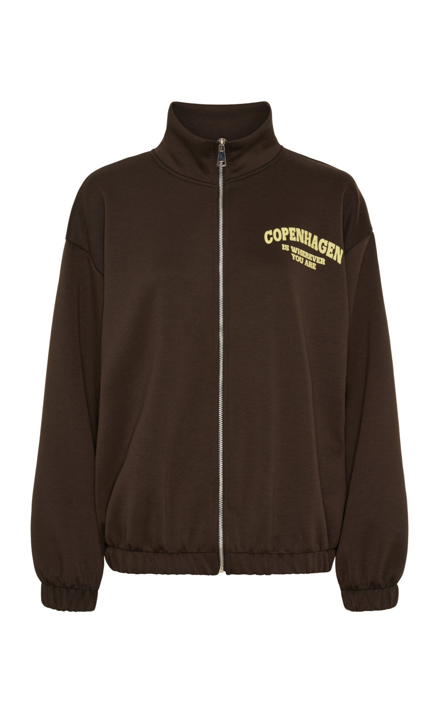 Cardiganen har høj krave, lynlåslukning foran, elastik ved talje og ærmer samt grafisk tekstprint på bryst og ærmer, som giver et sporty og moderne udtryk.