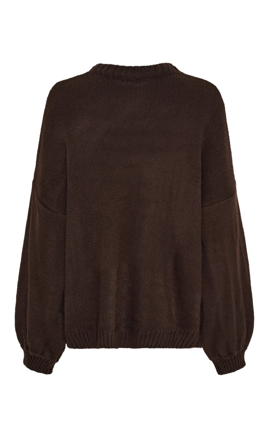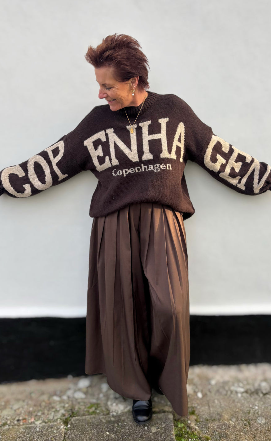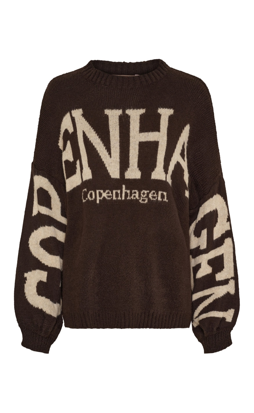 Cool striktrøje fra Marta Du Chateau i mørk brun med kontrastfarvet tekstprint i beige.