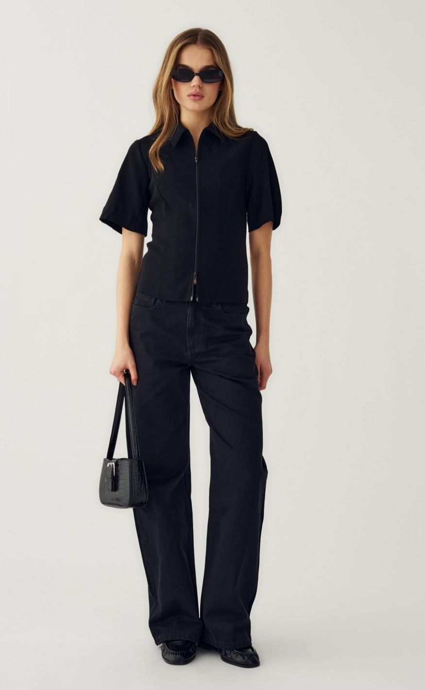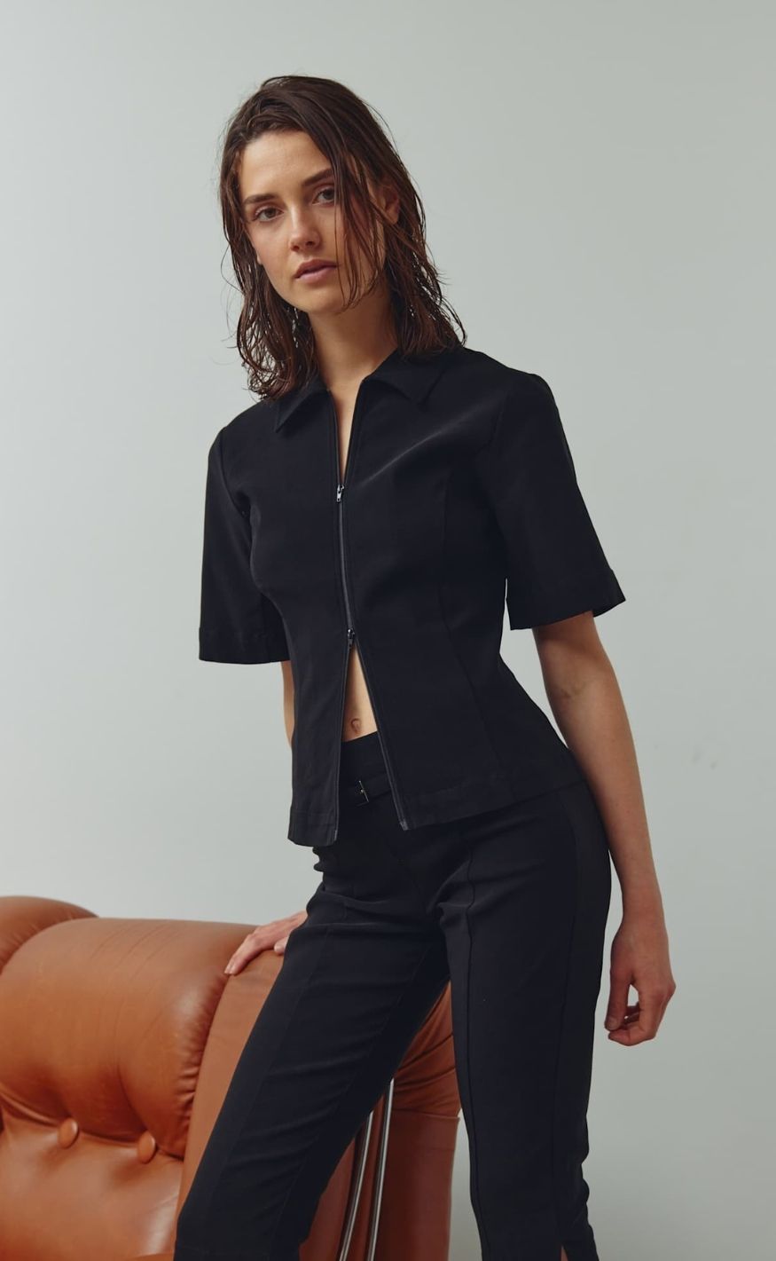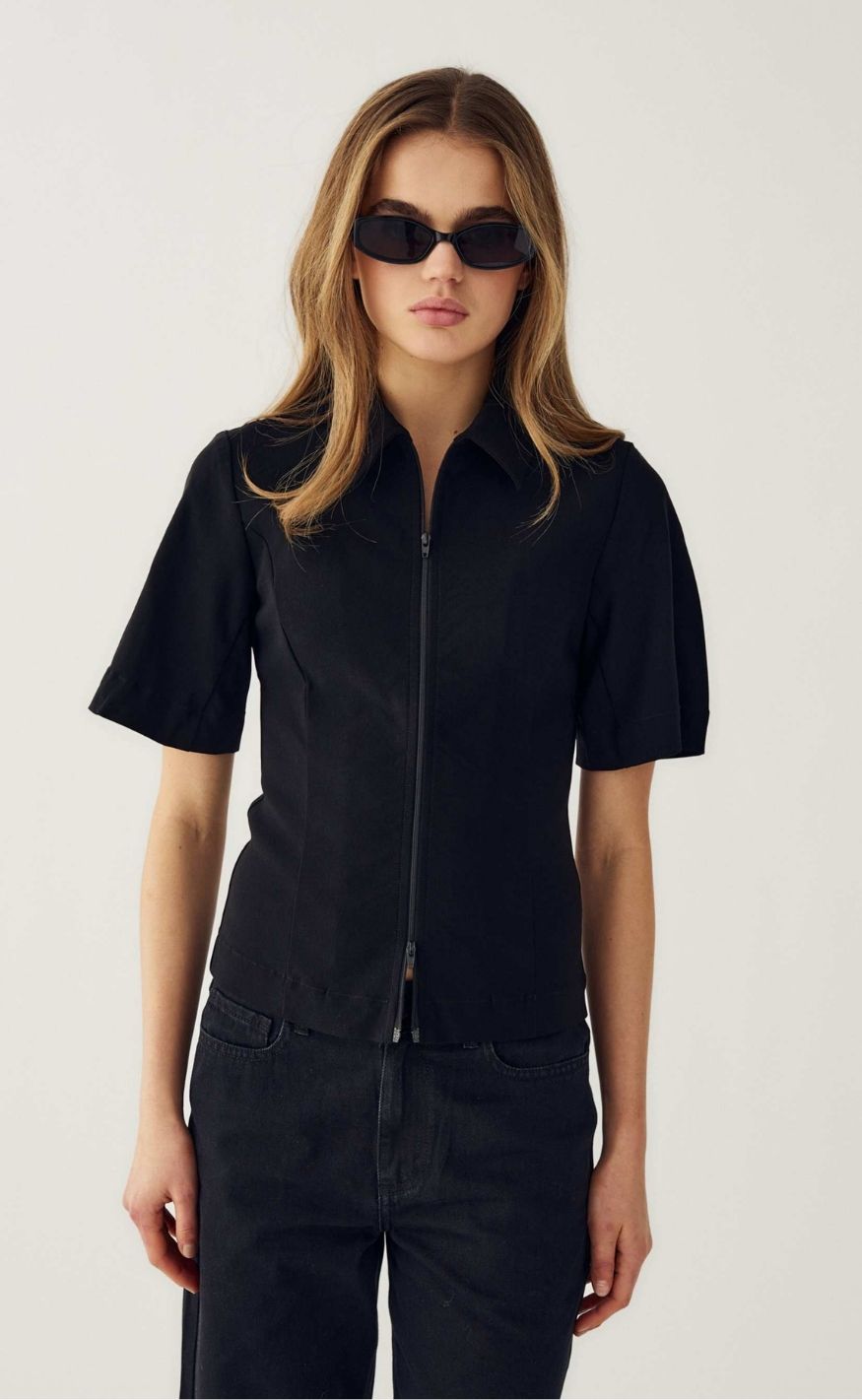 Stilren blazer fra Noella i klassisk sort med en feminin, figursyet pasform. Blazeren har krave, korte ærmer og lynlåslukning foran, der giver et moderne og minimalistisk udtryk.