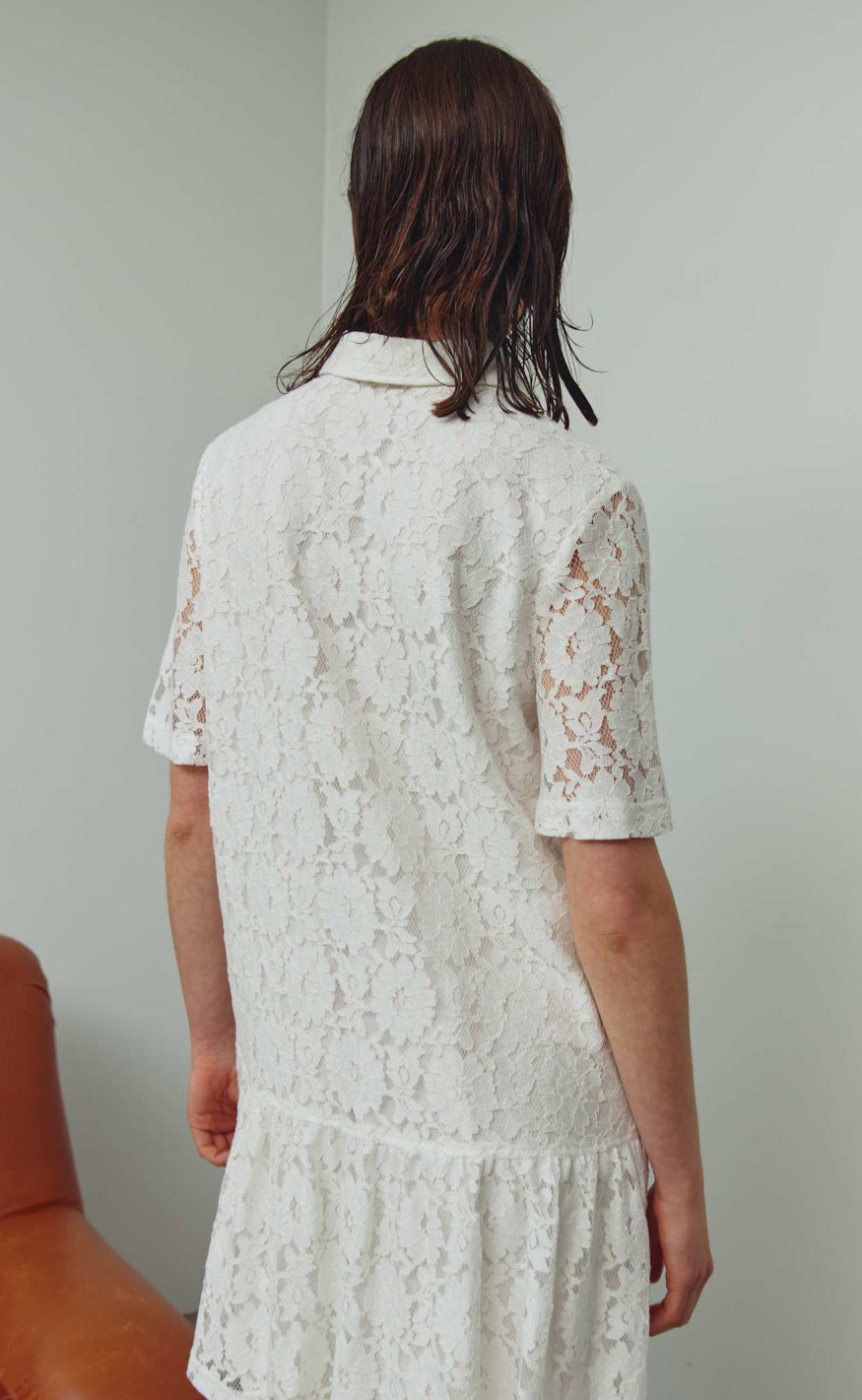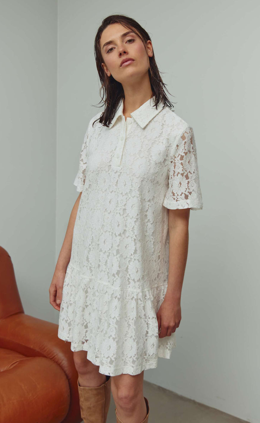 Kjolen har polokrave med kort knaplukning, korte ærmer og en løs pasform afsluttet med en blød flæsekant nederst, som giver et let og stilrent look.