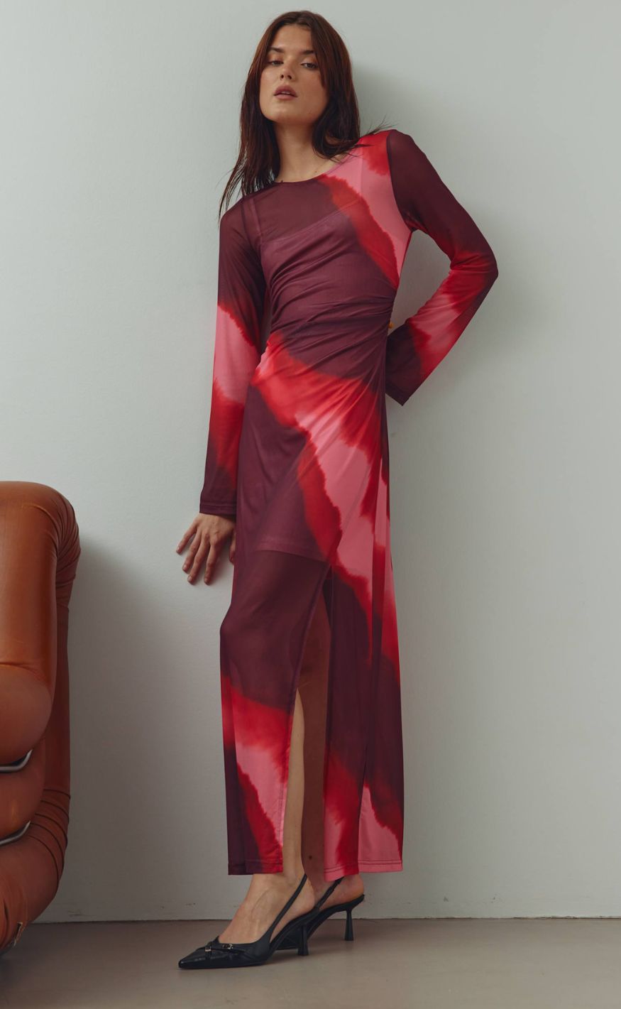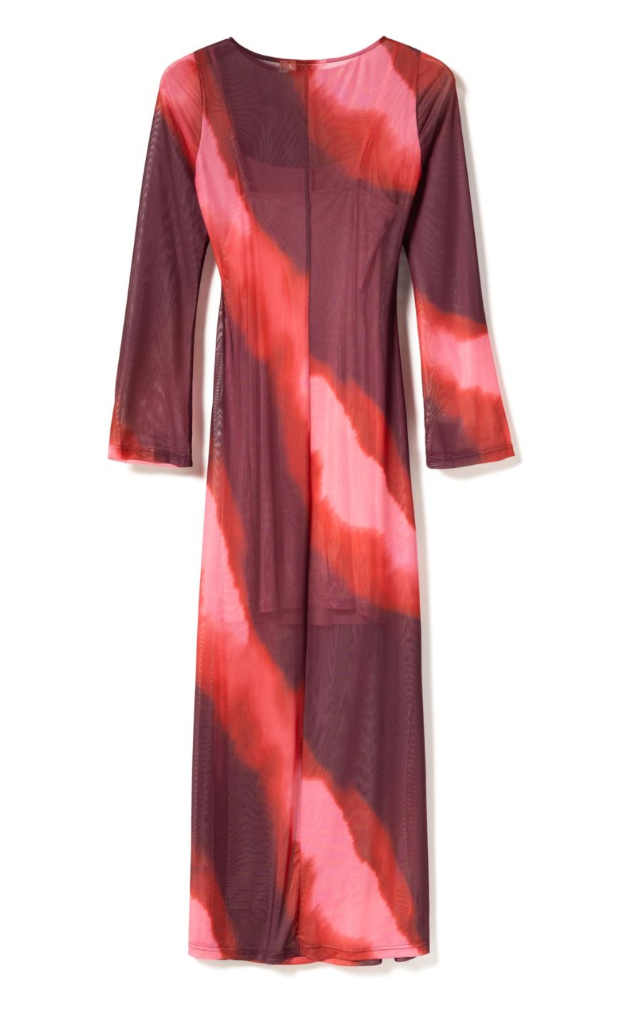 Elegant kjole fra Noella i smukke rød- og bordeauxnuancer med et kunstnerisk print, der giver et moderne og feminint udtryk. Den lette meshkvalitet, lange ærmer og slidsen foran skaber en flatterende silhuet, perfekt til både fest og særlige anledninger.
