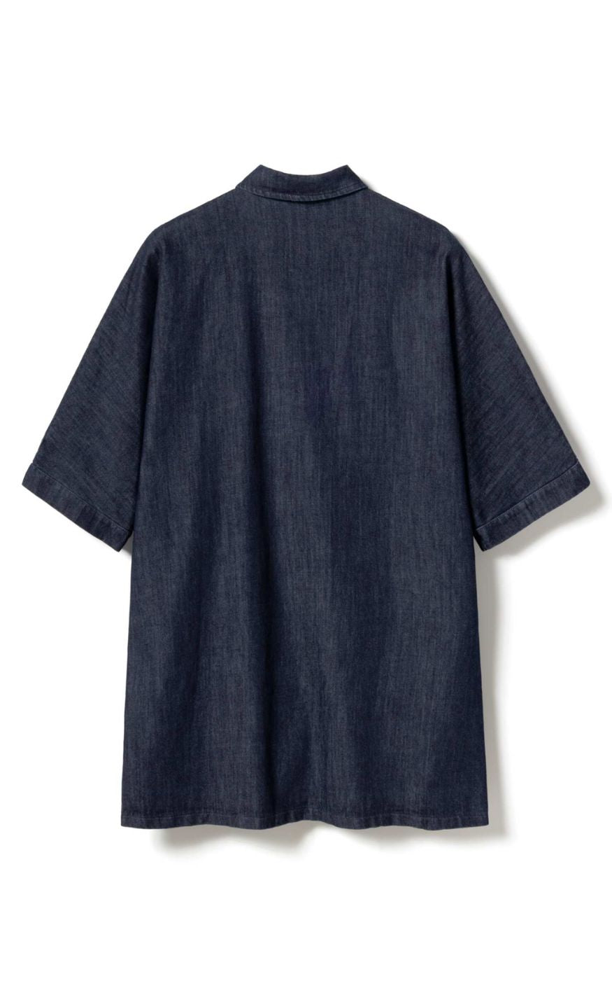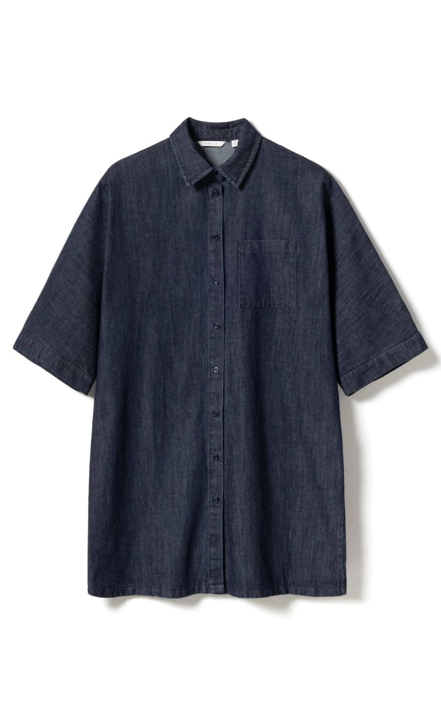 Cool denimkjole fra Noella i en mørkeblå vask med skjortekrave og knaplukning foran. Kjolen har korte, løse ærmer og en afslappet pasform, der giver et moderne og ubesværet udtryk.