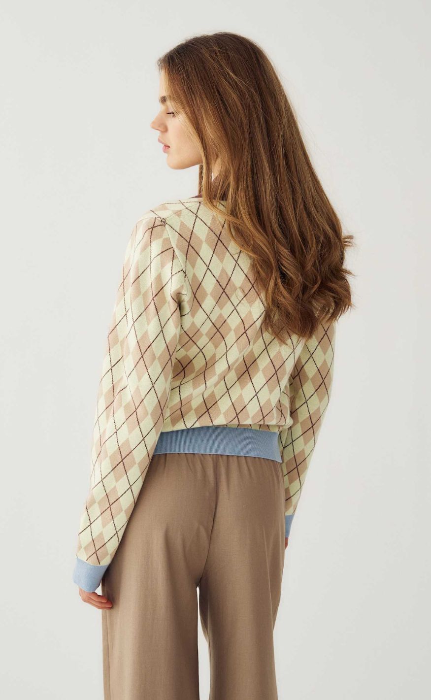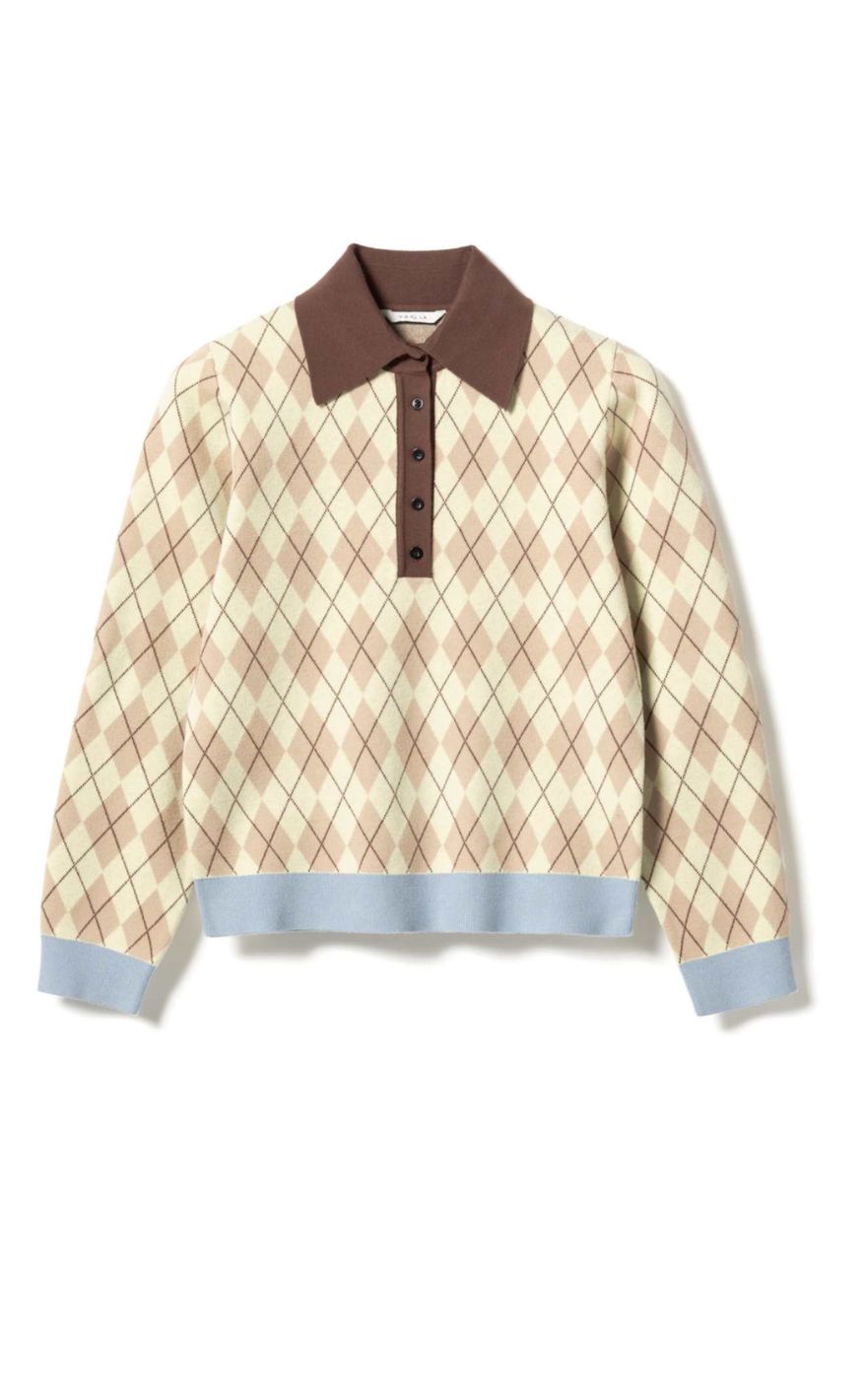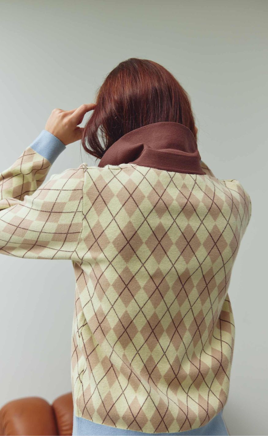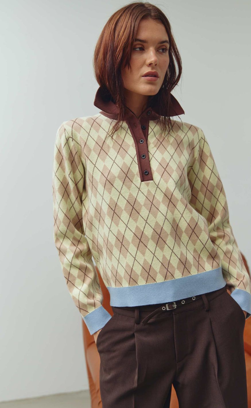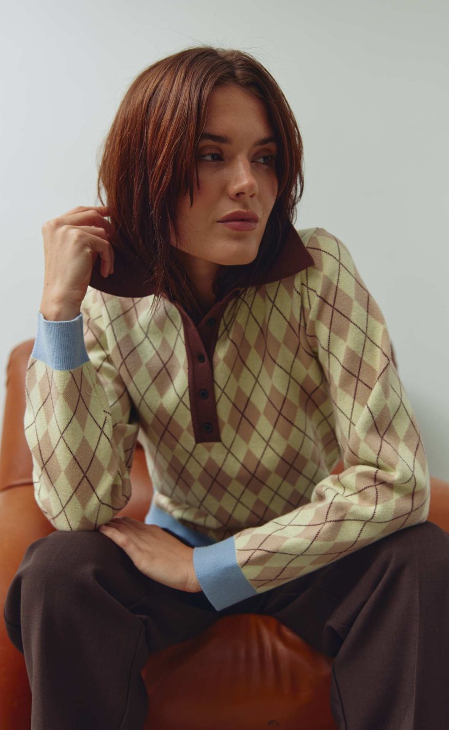 Klassisk strik fra Noella med diskret harlekinmønster og kontrastkrave, der giver et elegant og lidt retro-inspireret udtryk. Den afslappede pasform gør den nem at style både til jeans og mere feminine nederdele.