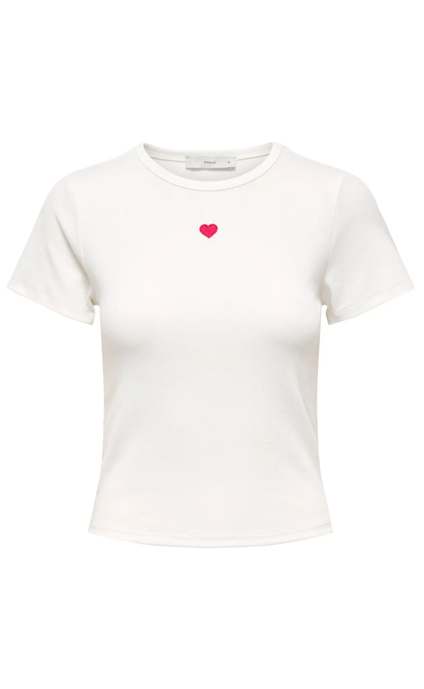 Klassisk T‑shirt fra ONLY i en ren hvid nuance med et lille pink broderet hjerte på brystet.