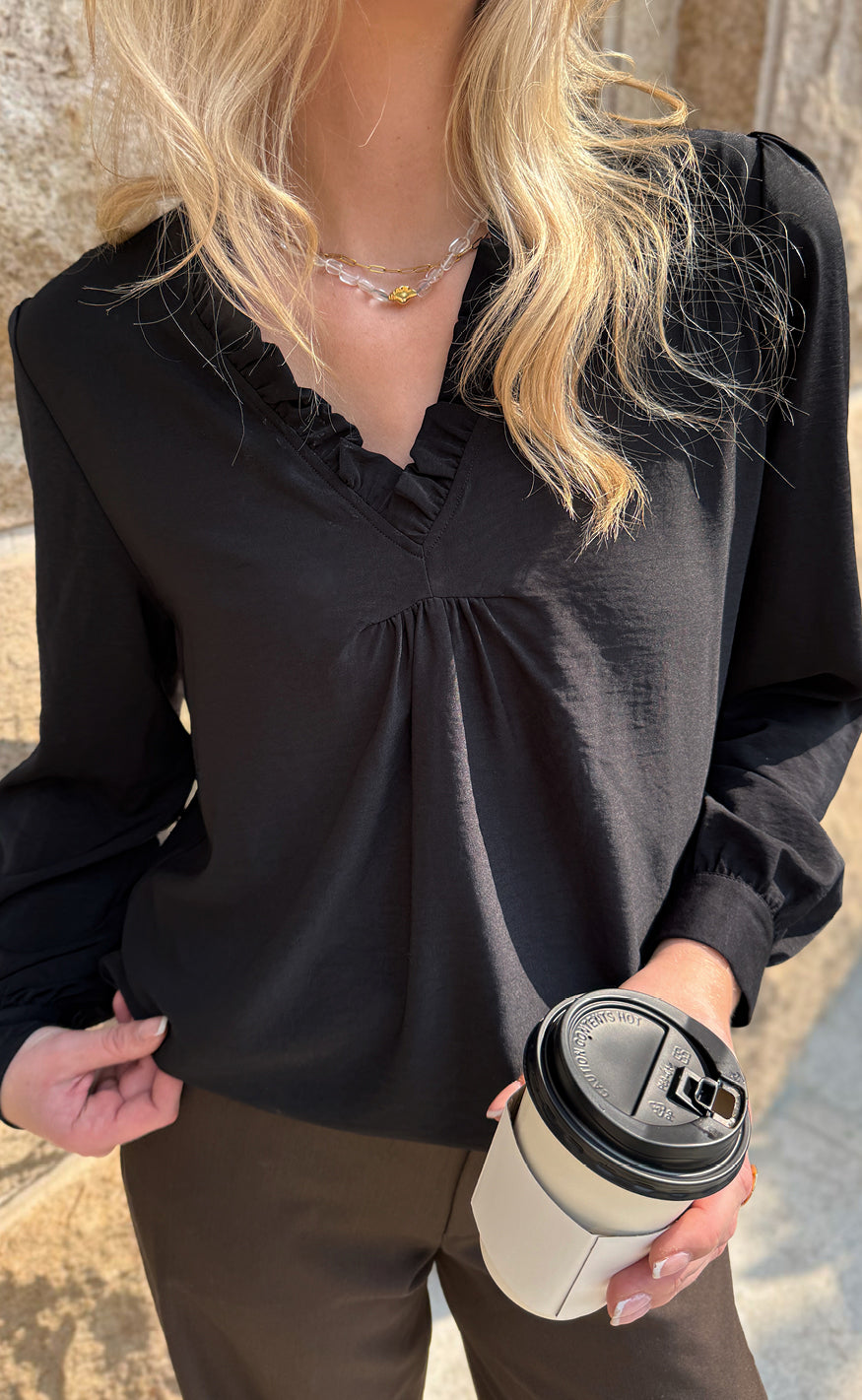 Blusen har lange ærmer med manchet, en fin v-hals med flæser og en syning ved brystet, som sikrer en virkelig flot pasform.