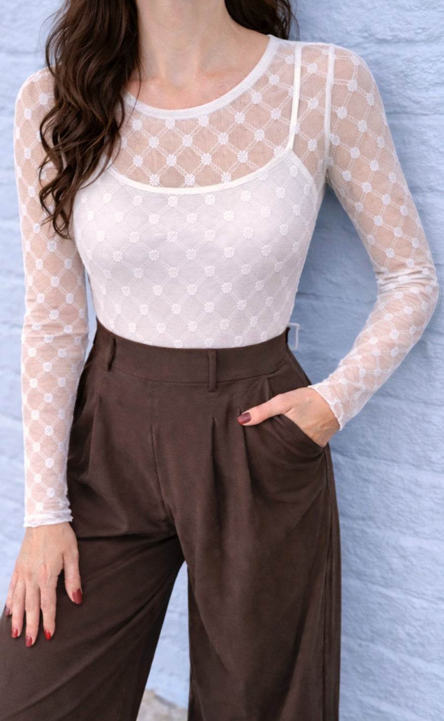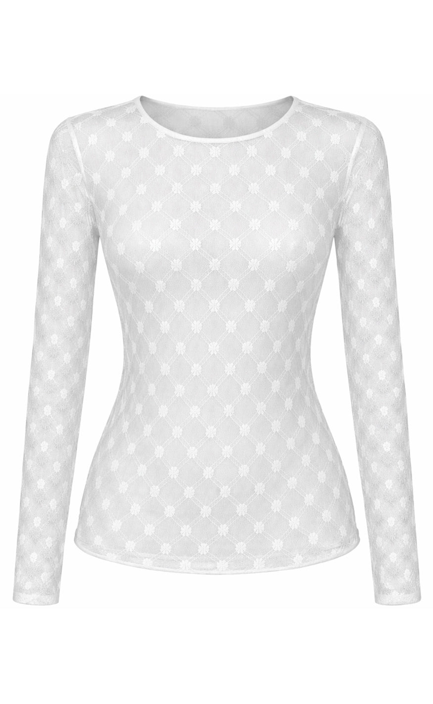 Fin transparent mesh bluse i hvid med et gittermønster, der har små blomster i midten.