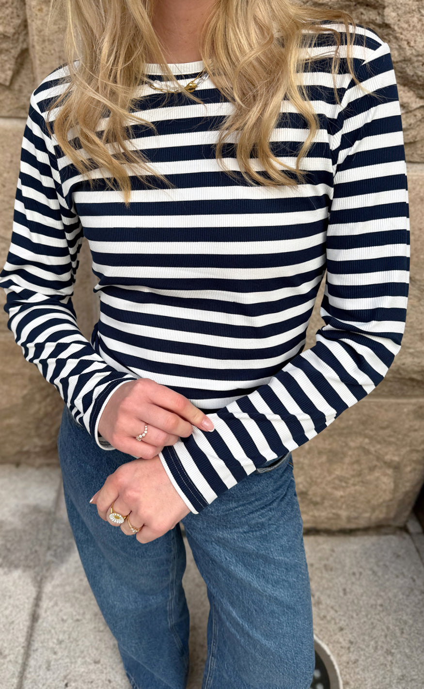 Smart bluse fra Say INA Copenhagen med striber i navy og off white.