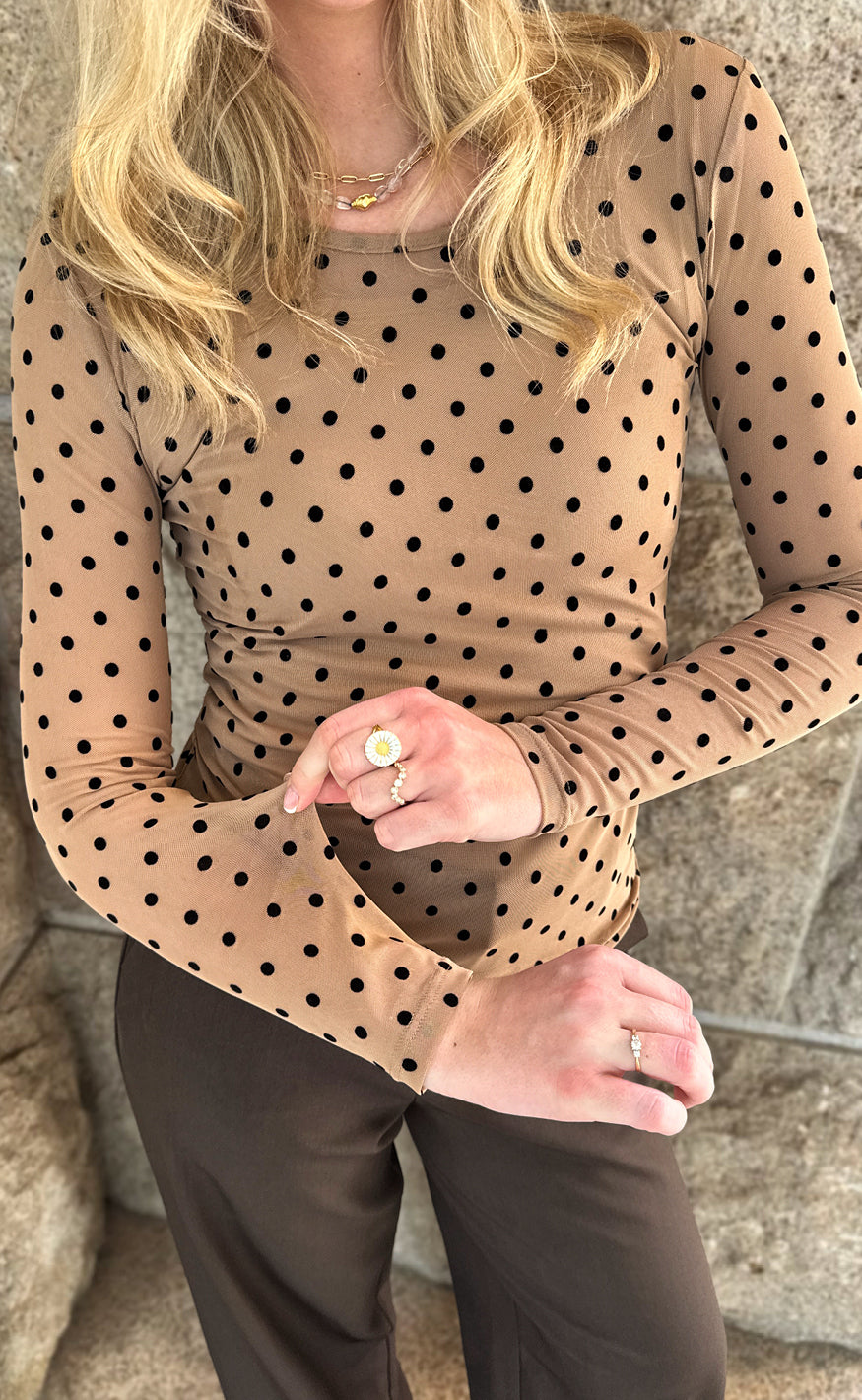 Flot og smart mesh bluse fra Say INA Copenhagen i camel med sorte velour prikker.