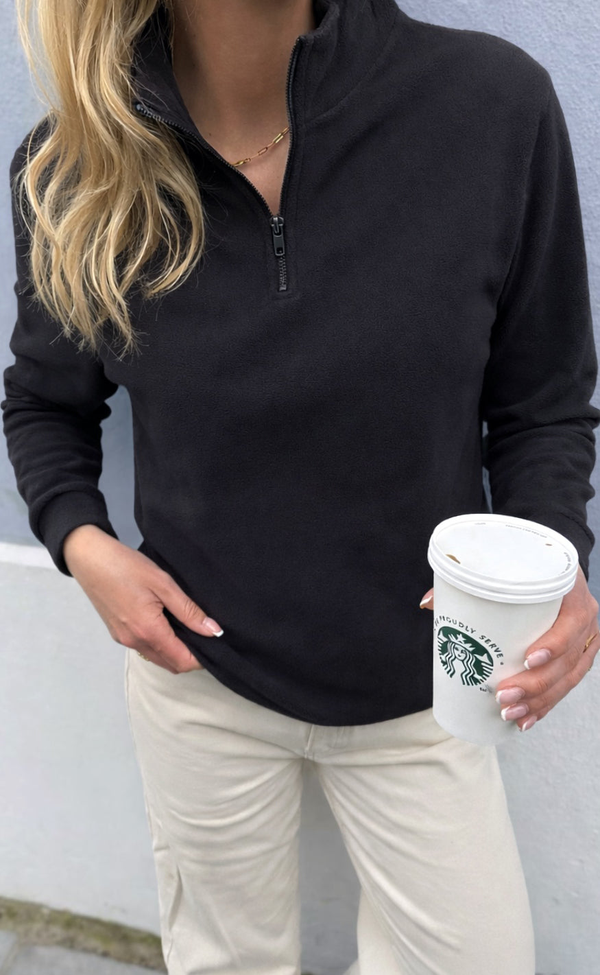 Fleetrøjen kan åbnes med lynlås ved halsen og er et must-have på kølige dage!