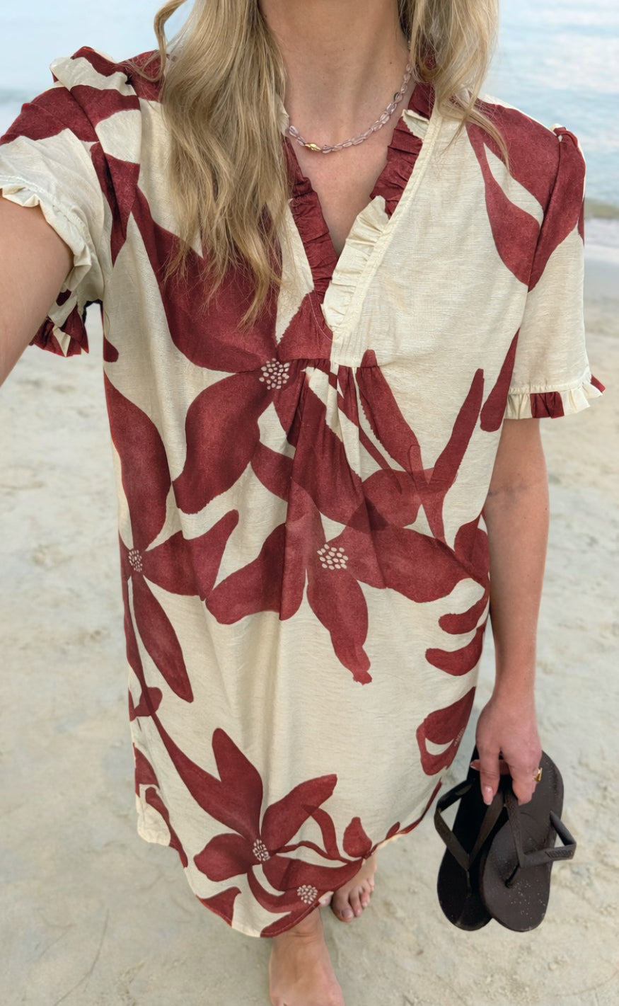 Smuk kjole fra Say INA Copenhagen i off white med røde blomster.