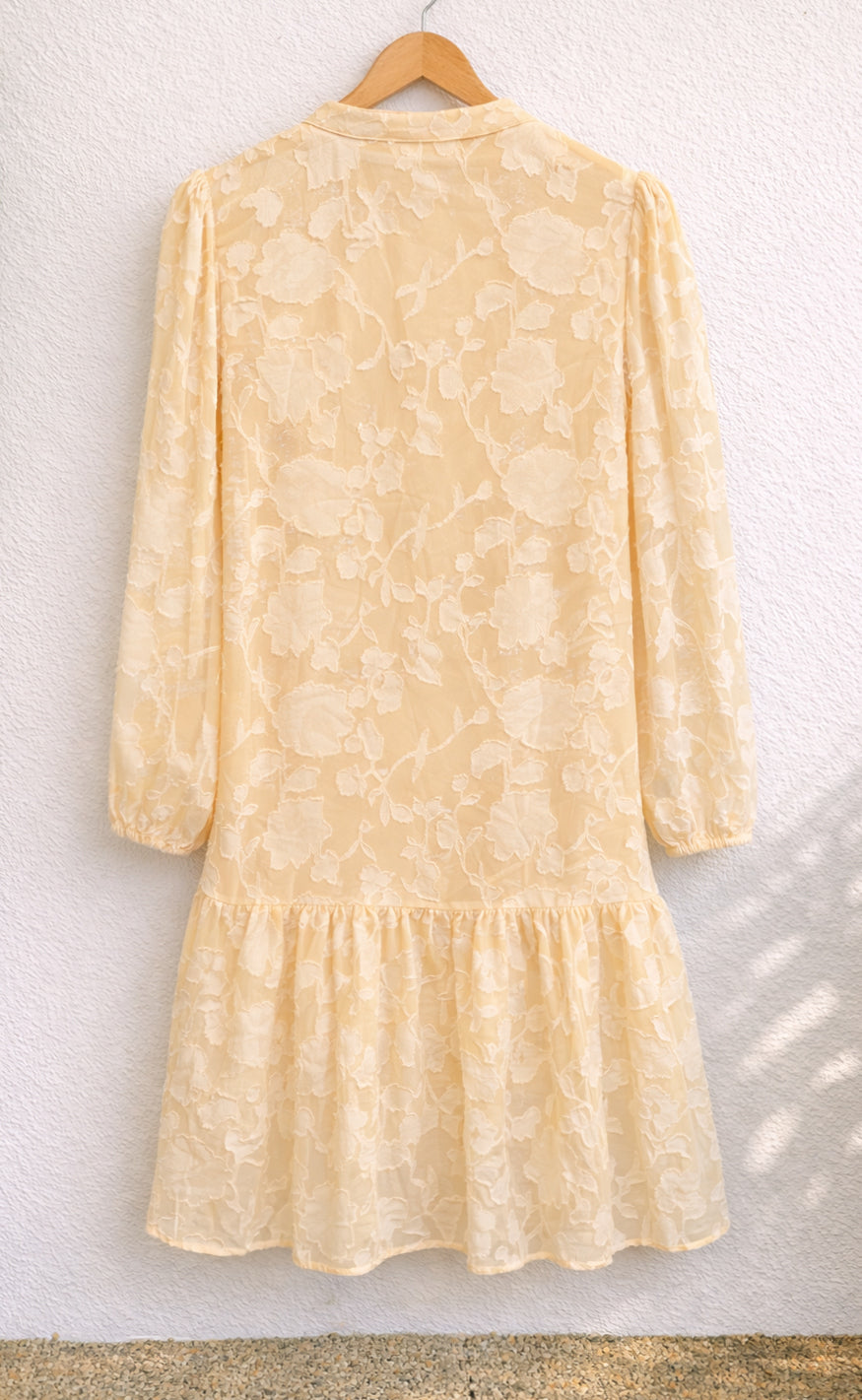 Kjolen har lange ærmer med elastik omkring håndled, en åbning med knapper og en fin overskæring i bunden af kjolen.
