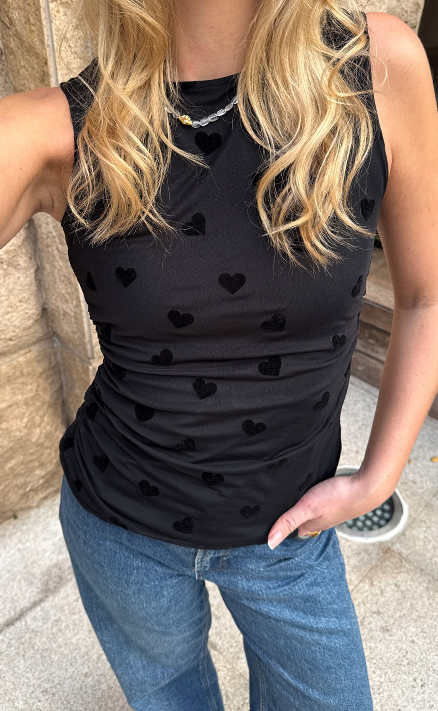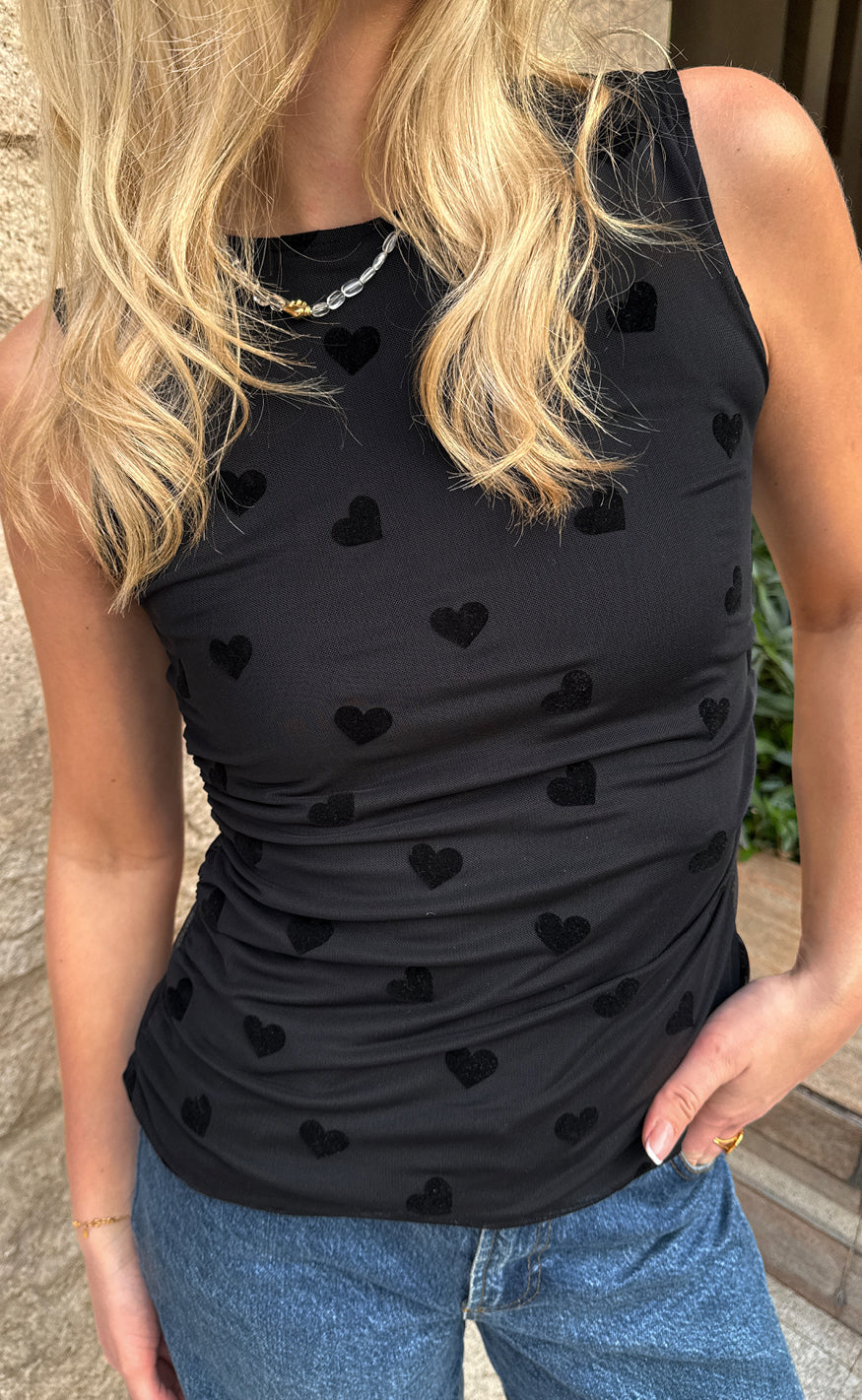 Smart mesh top fra Say INA Copenhagen i sort med sorte hjerter.