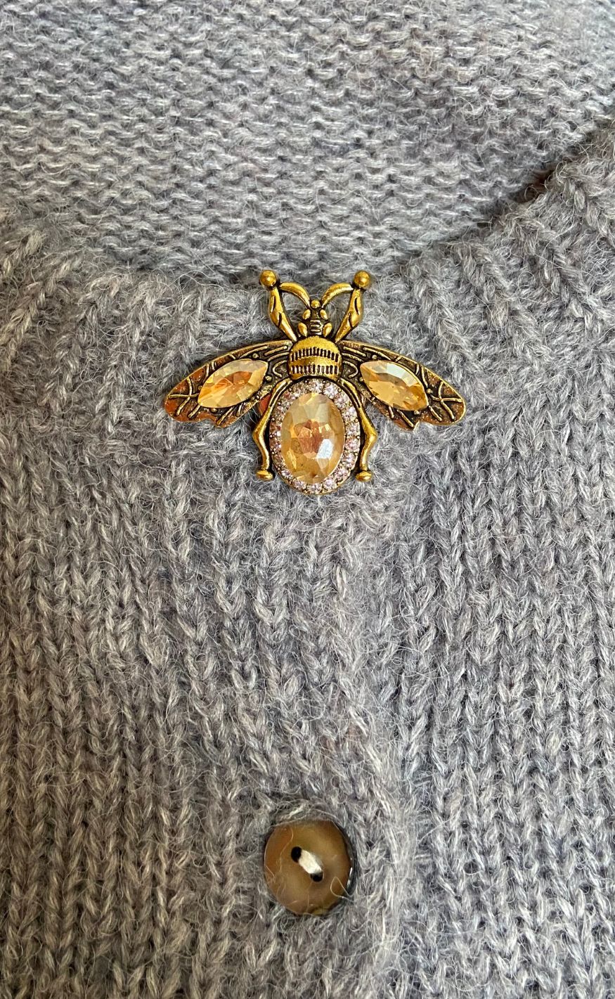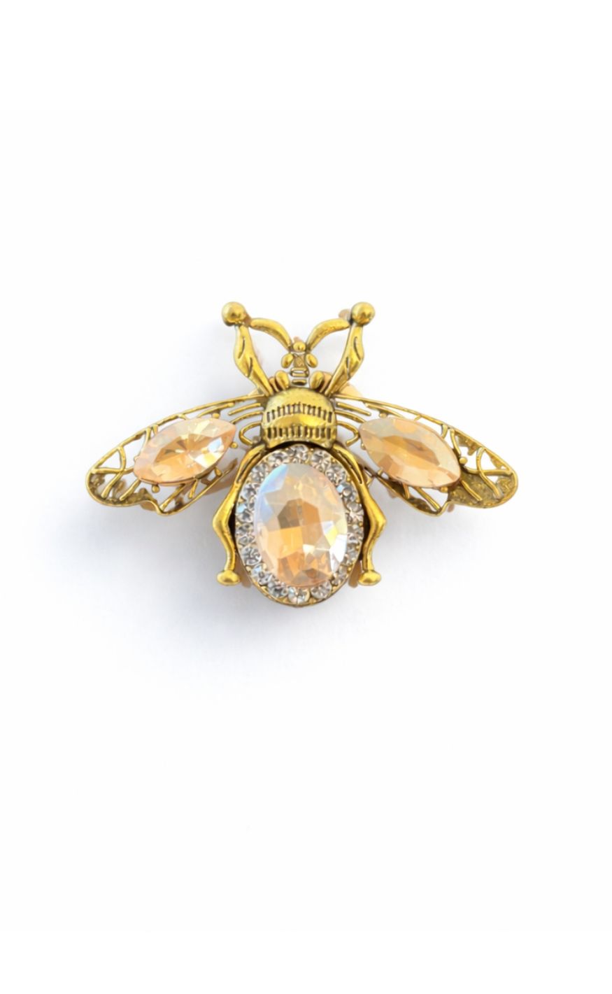 Dekorativt button cover formet som en bi i guldfarvet metal med funklende krystaldetaljer. Giver skjorter og bluser et elegant og eksklusivt udtryk.