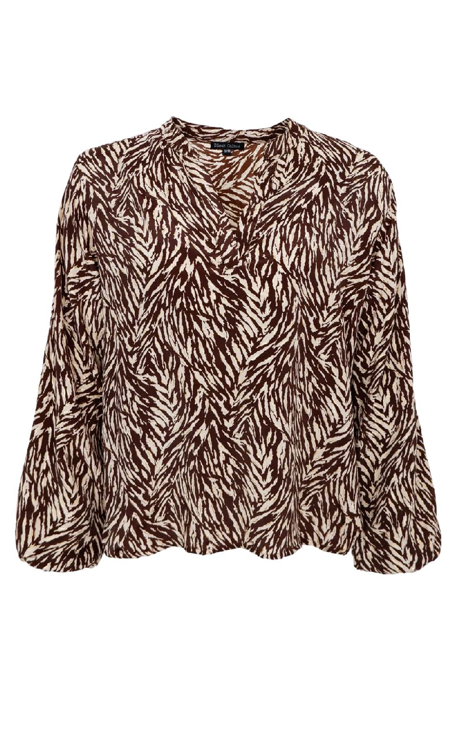 Mønstret bluse fra Black Colour i et brun- og cremefarvet print. Blusen har lange ærmer og en v-udskæring, der giver et elegant udtryk.