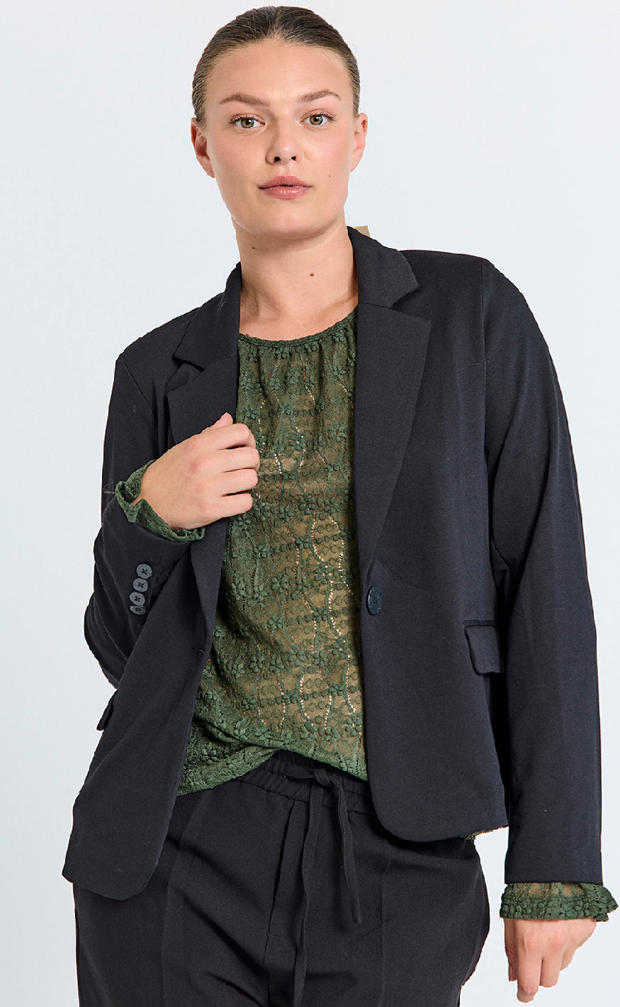 Sort blazer fra Freequent med klassisk revers og enkeltknaplukning, designet i en tidløs stil med to frontlommer – perfekt til både hverdag og festlige anledninger.