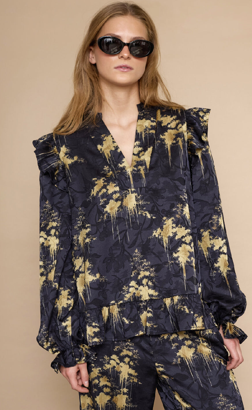 Skjorte fra Love & Divine med dekorativt mønster, V-hals, lange ærmer med flæsekanter og en flæsekant forneden, der tilføjer et feminint og elegant udtryk.