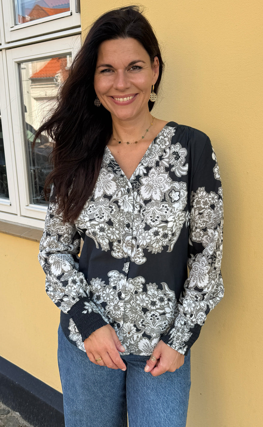 Skjorten har lange ærmer med smock omkring håndled, v-hals og en åbning med knapper fortil.