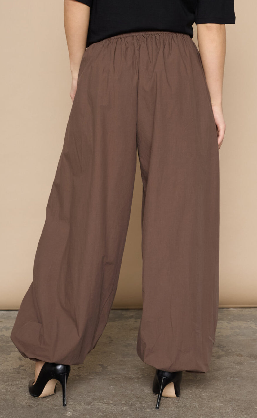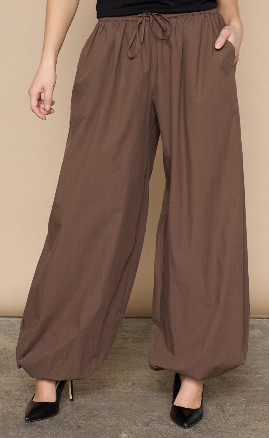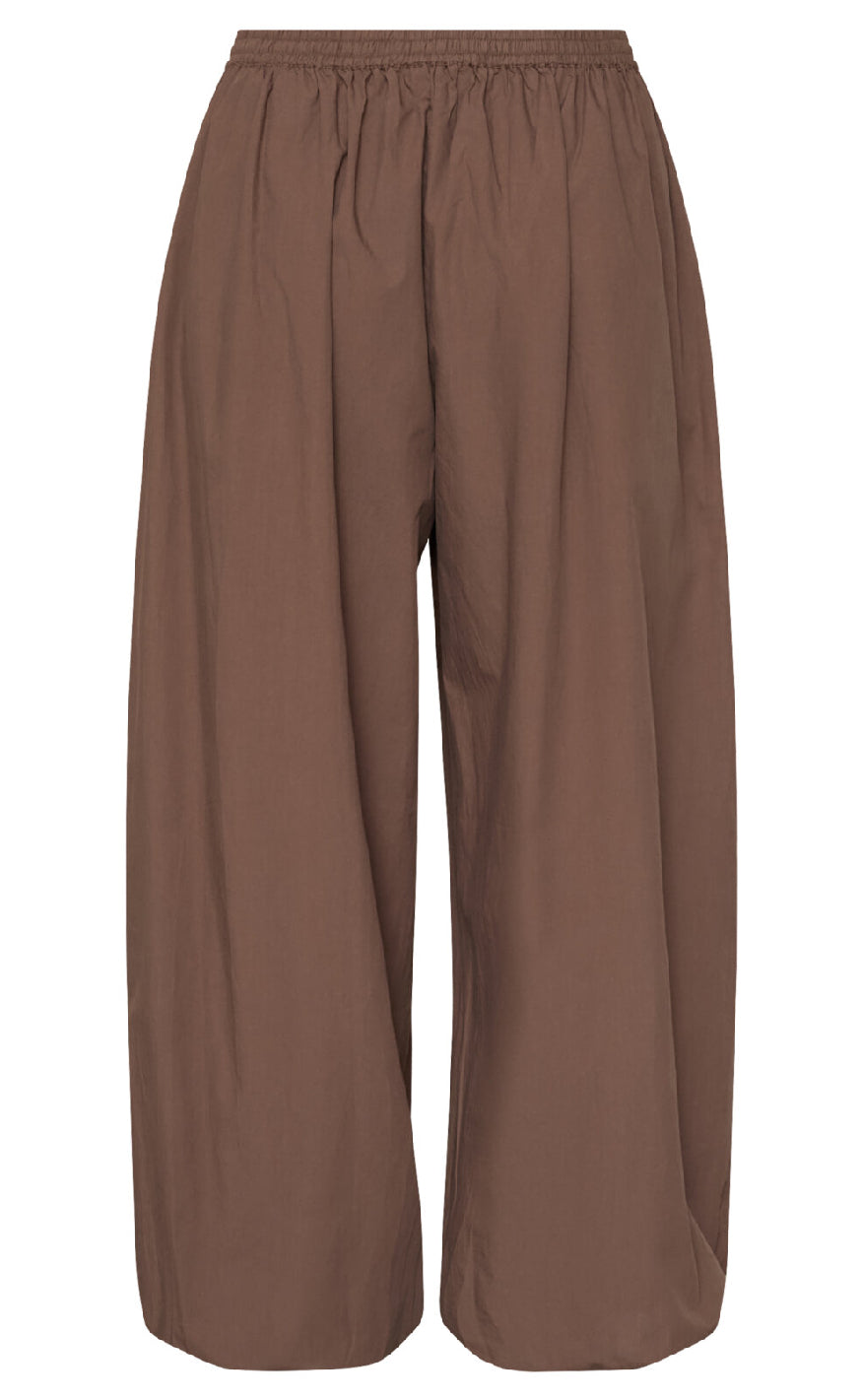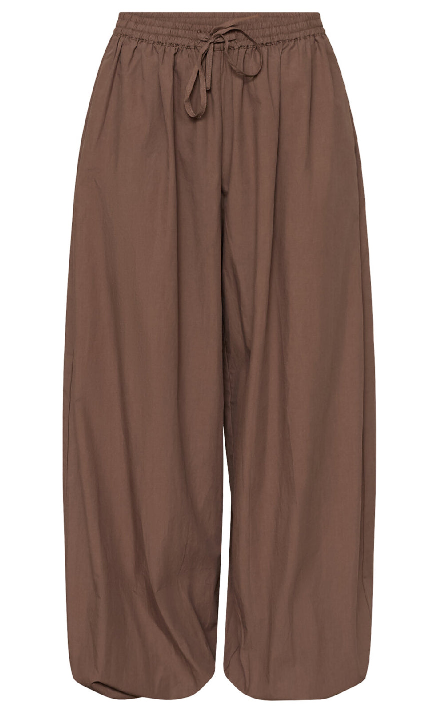 Løse, brune bukser med elastisk talje og bindebånd – komfortabelt og stilrent design til hverdagsbrug.