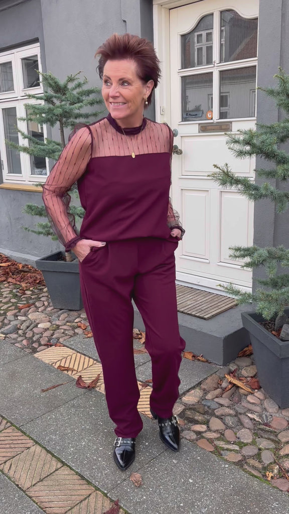 Virkelig smuk og eksklusiv buksedragt fra INA Copenhagen i bordeaux.