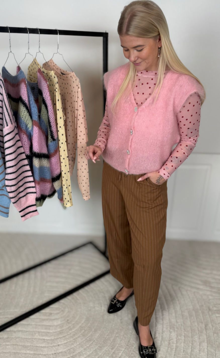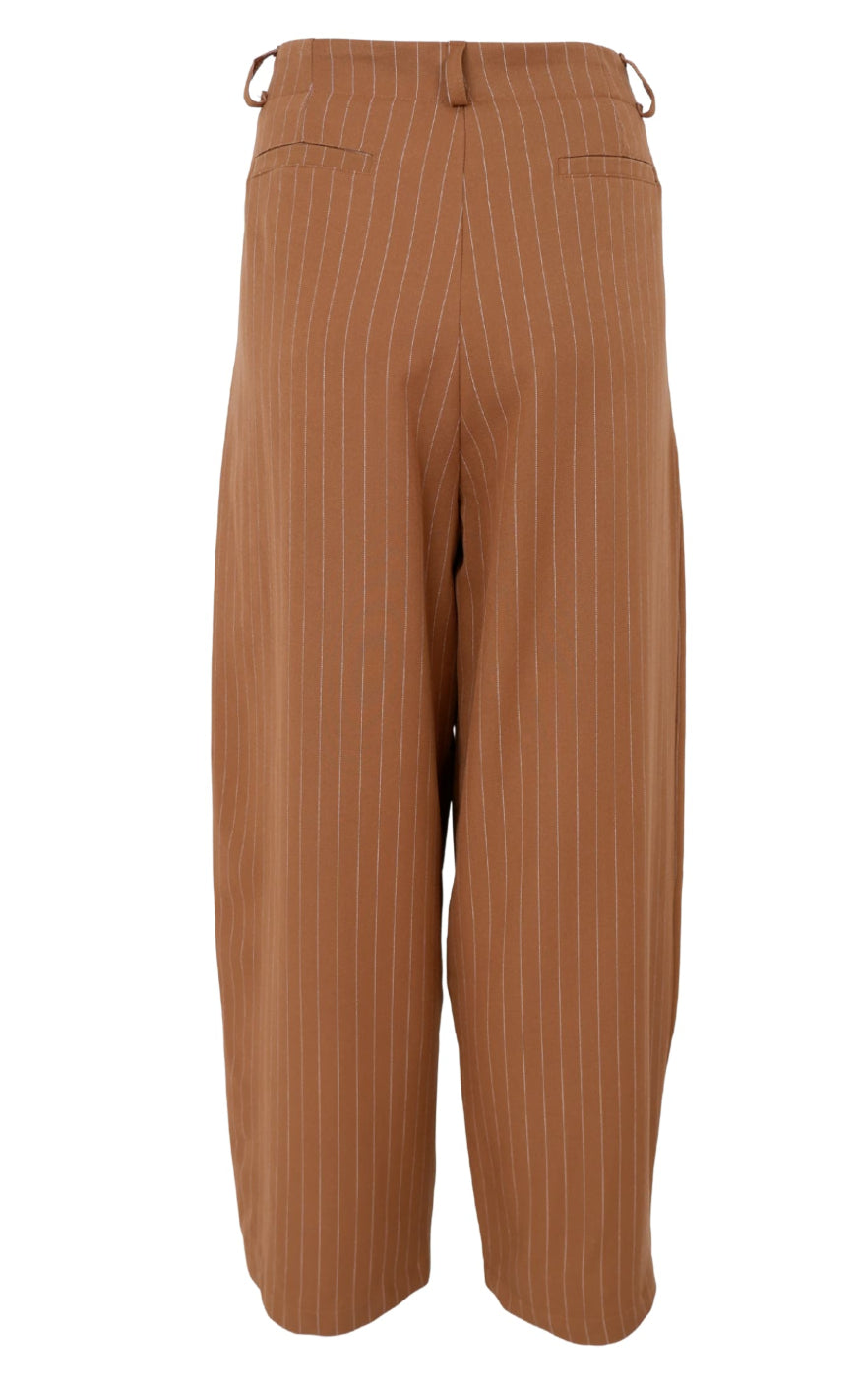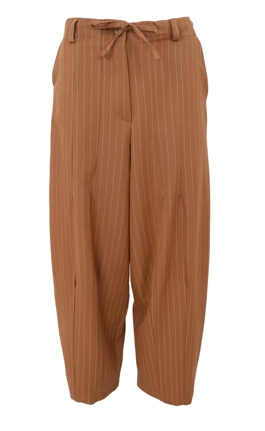 Brune pinstripe bukser fra Black Colour med løstsiddende, cropped pasform og bindebånd i taljen.