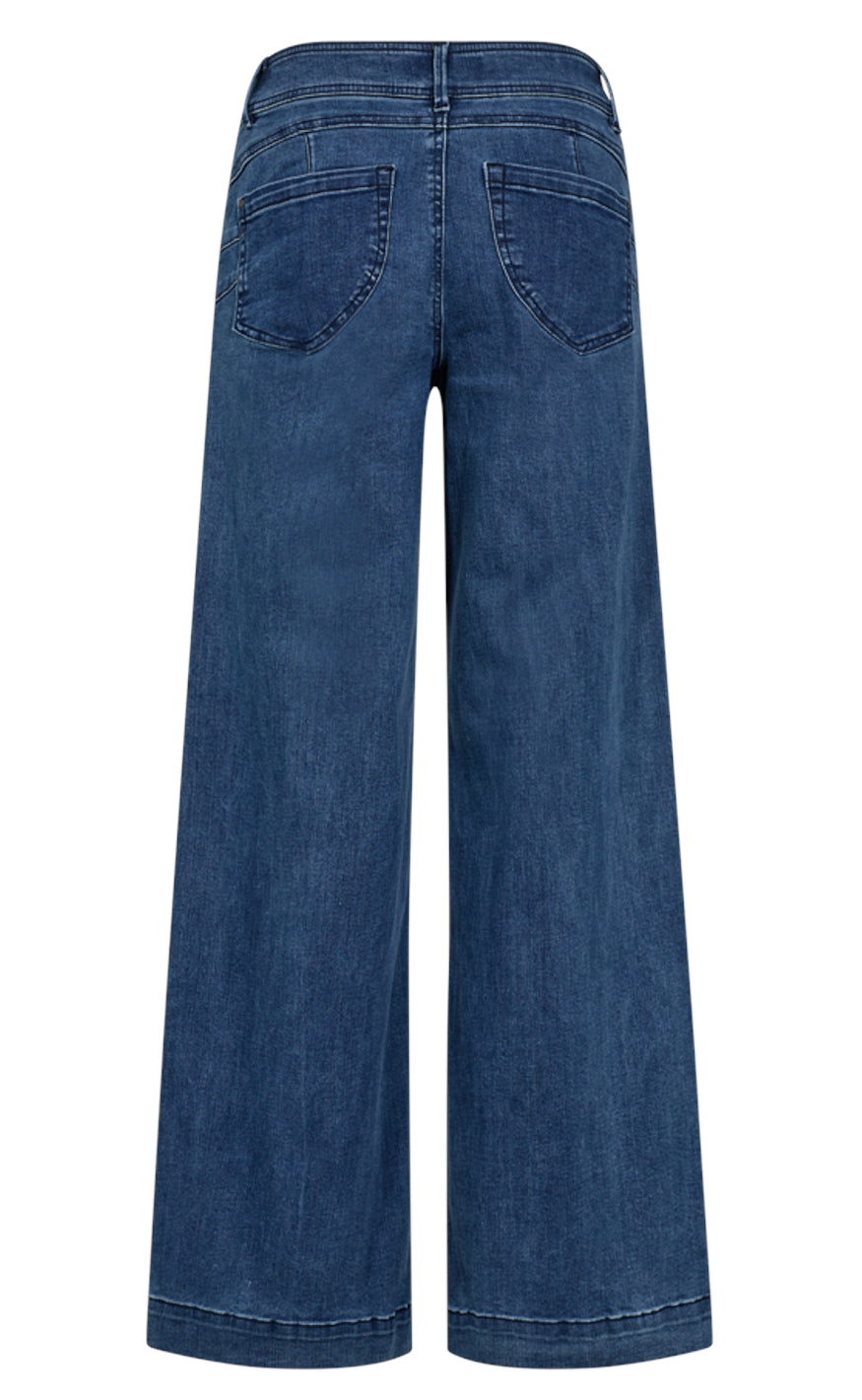 Jeansene har høj talje, brede ben og dobbelte knapper foran, der giver et stilrent udtryk.