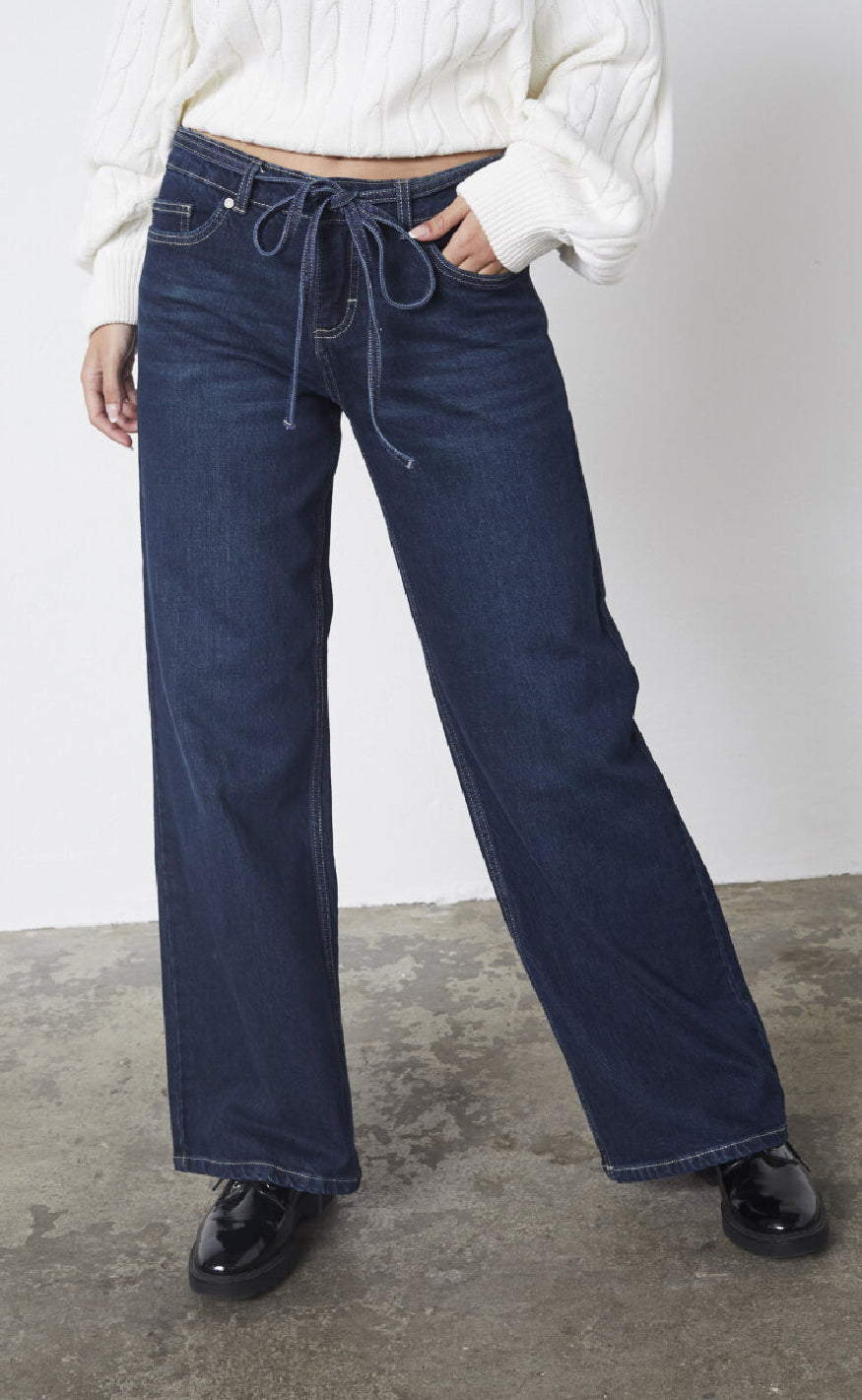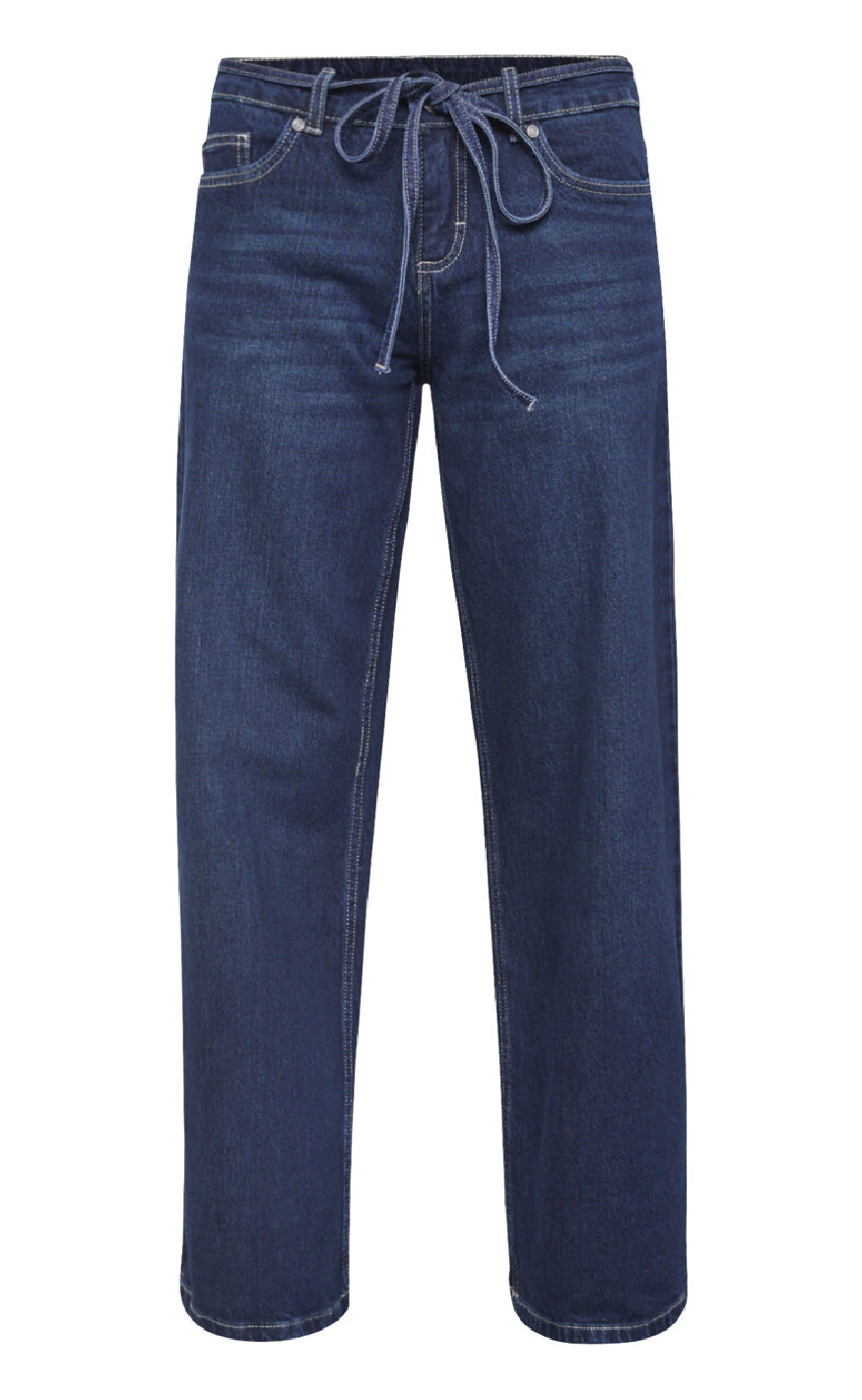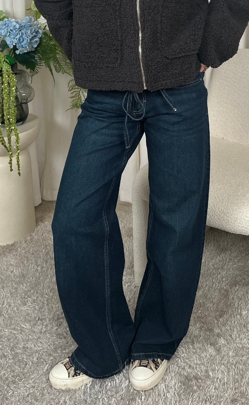 Klassiske mørkeblå jeans fra Sisters Point med lige ben og bindebælte i taljen – perfekt til et afslappet, stilrent look.