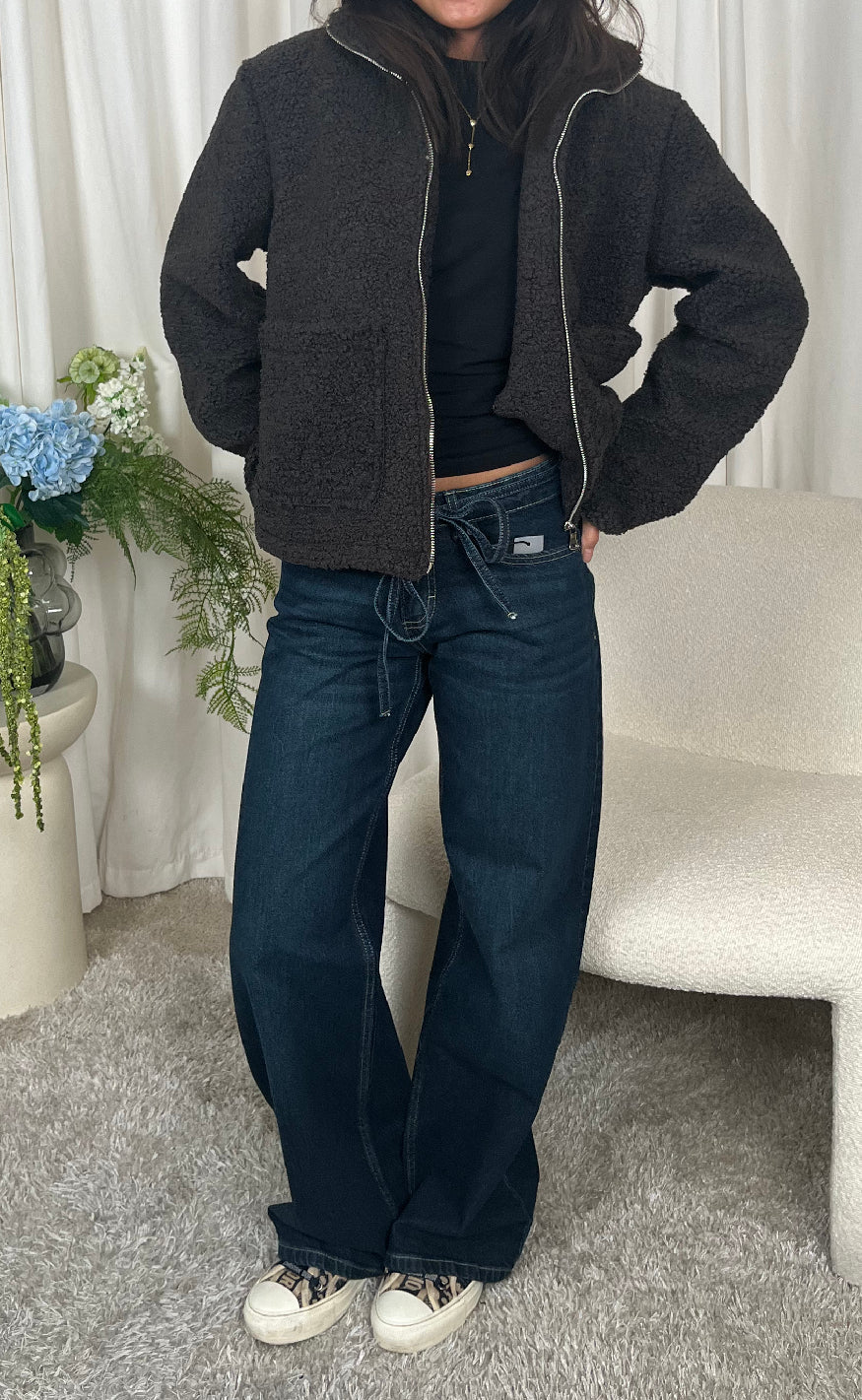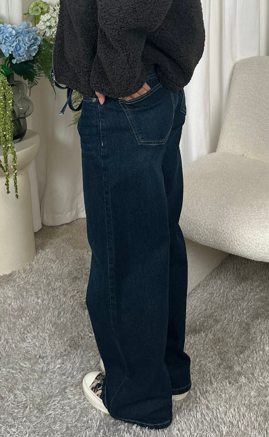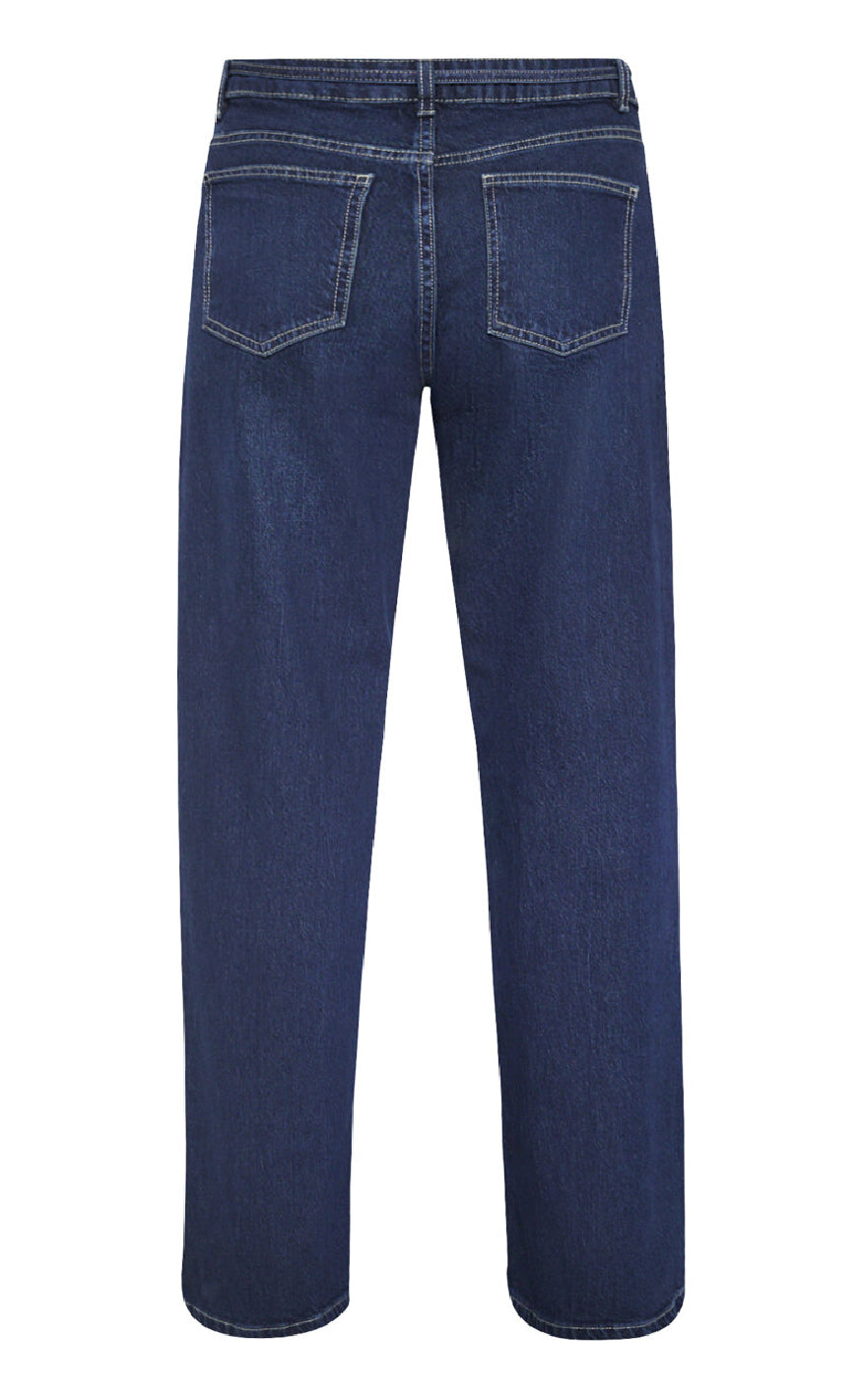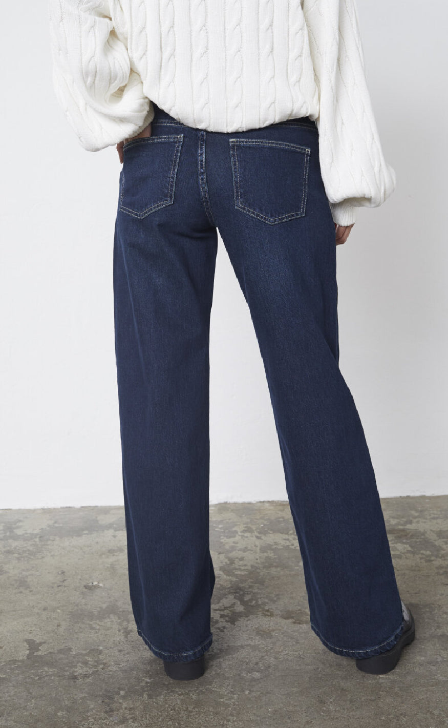 Klassiske mørkeblå jeans fra Sisters Point med lige ben og bindebælte i taljen – perfekt til et afslappet, stilrent look.