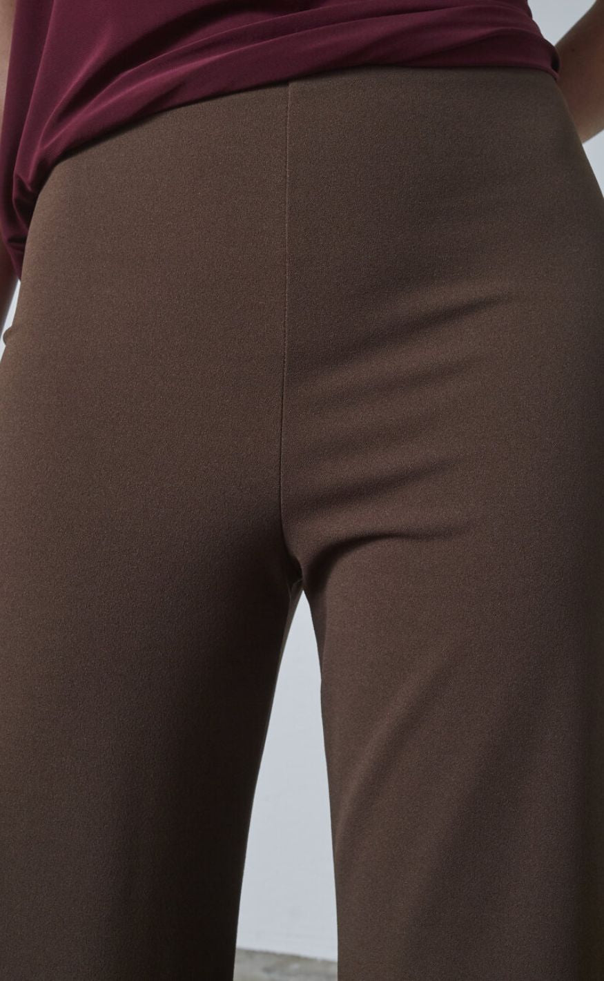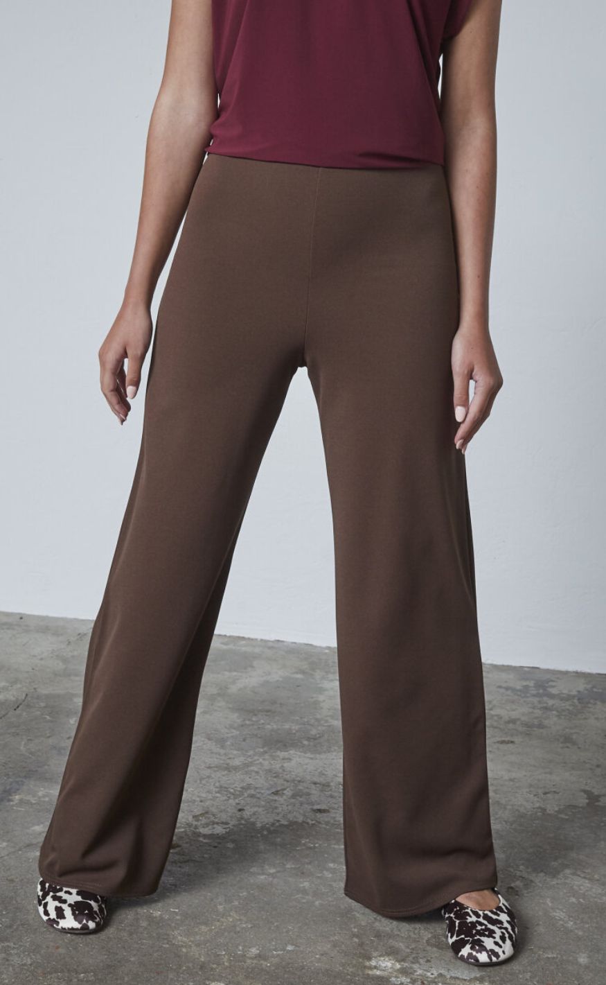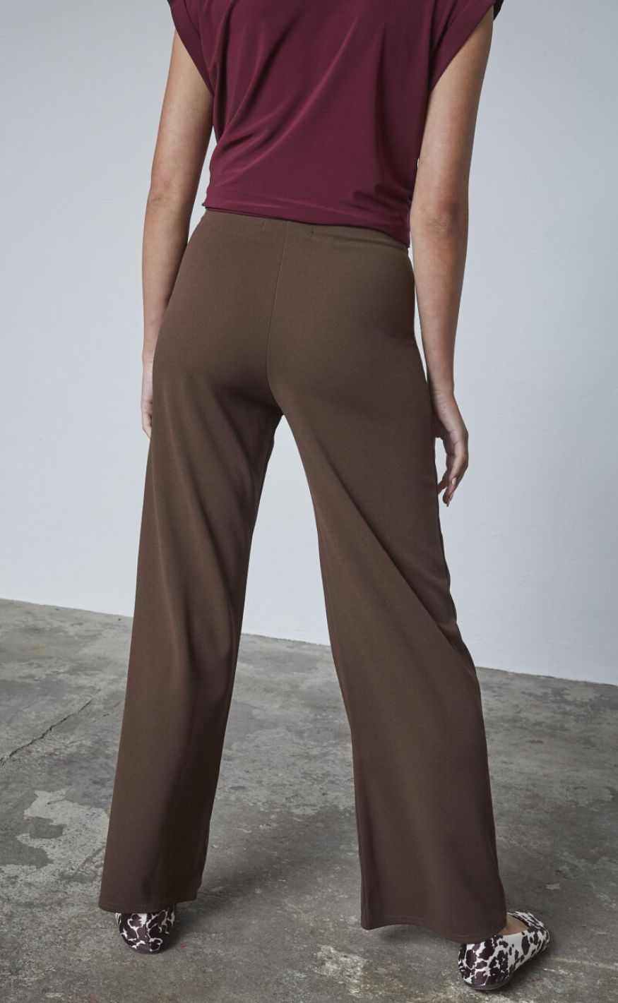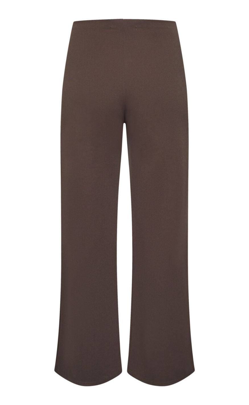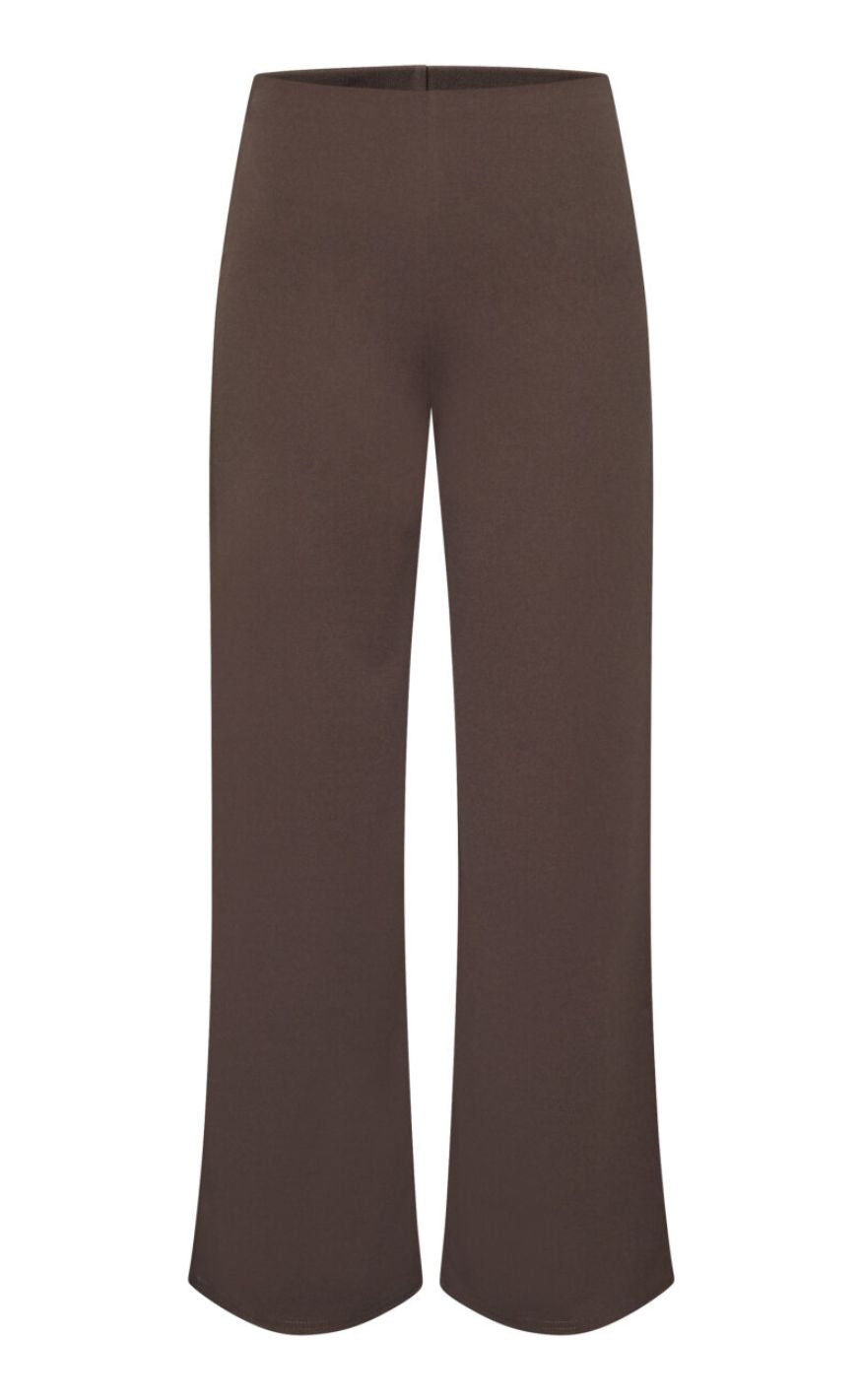 Ensfarvede lange bukser i brun med brede ben og en høj talje med elastik.