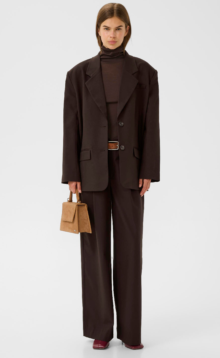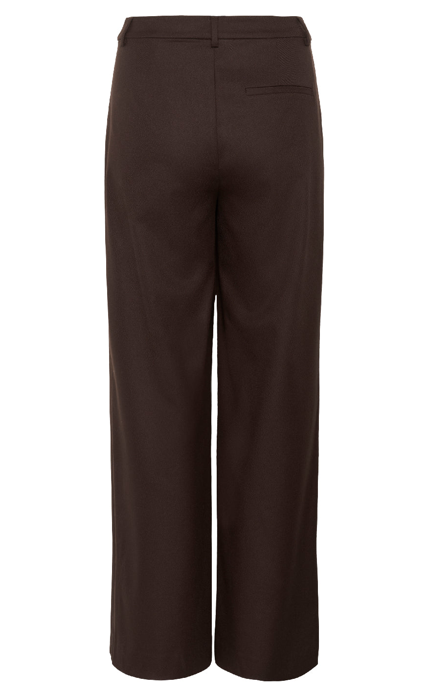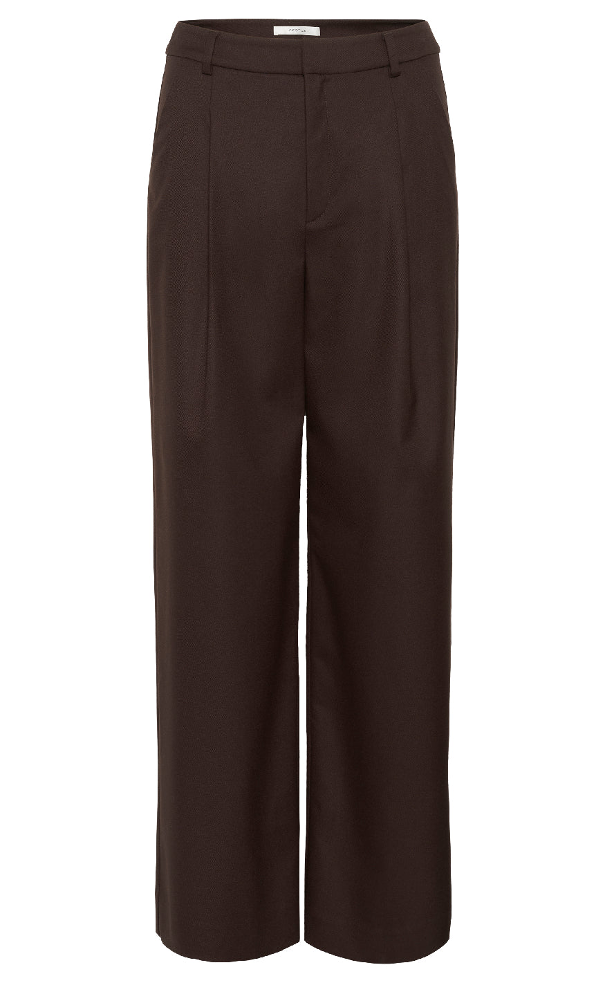 Et par klassiske, vide bukser fra Gestuz i mørkebrun med høj talje, pressefolder og bæltestropper. Bukserne har en elegant og tidløs pasform, der gør dem perfekte til både kontor og mere afslappede outfits.